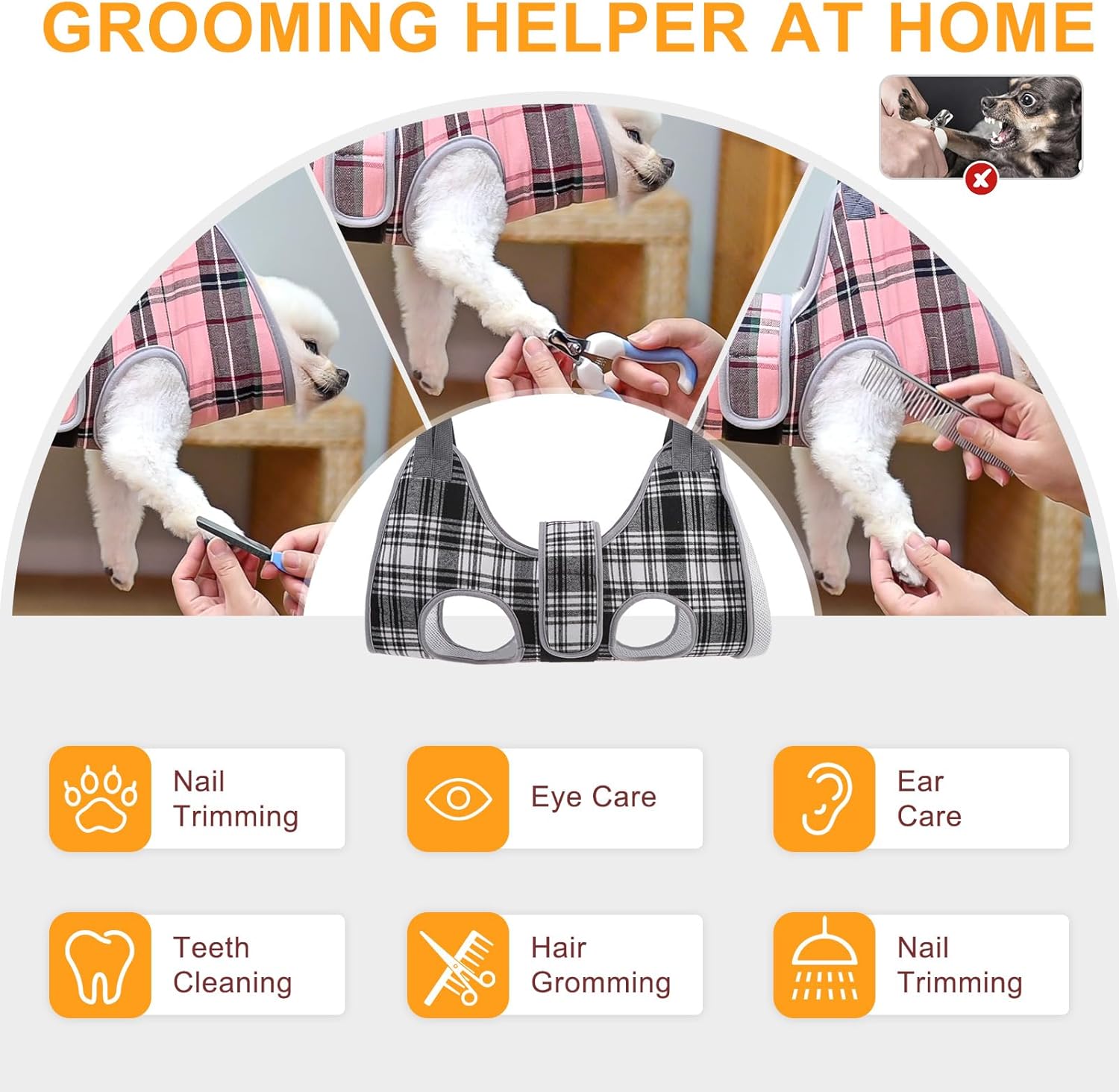 - Professional Dog Grooming Kit- The dog grooming harness set includes sturdy, thickened, and extra strong carabiners x2, dog nail clippers with safety device design x1, file x1, steel comb x1, and webbing tapes for irregular bars or bars that are too thick x2. Clipping nails, trimming hair, applying topicals and grooming at home is easy with this kit
