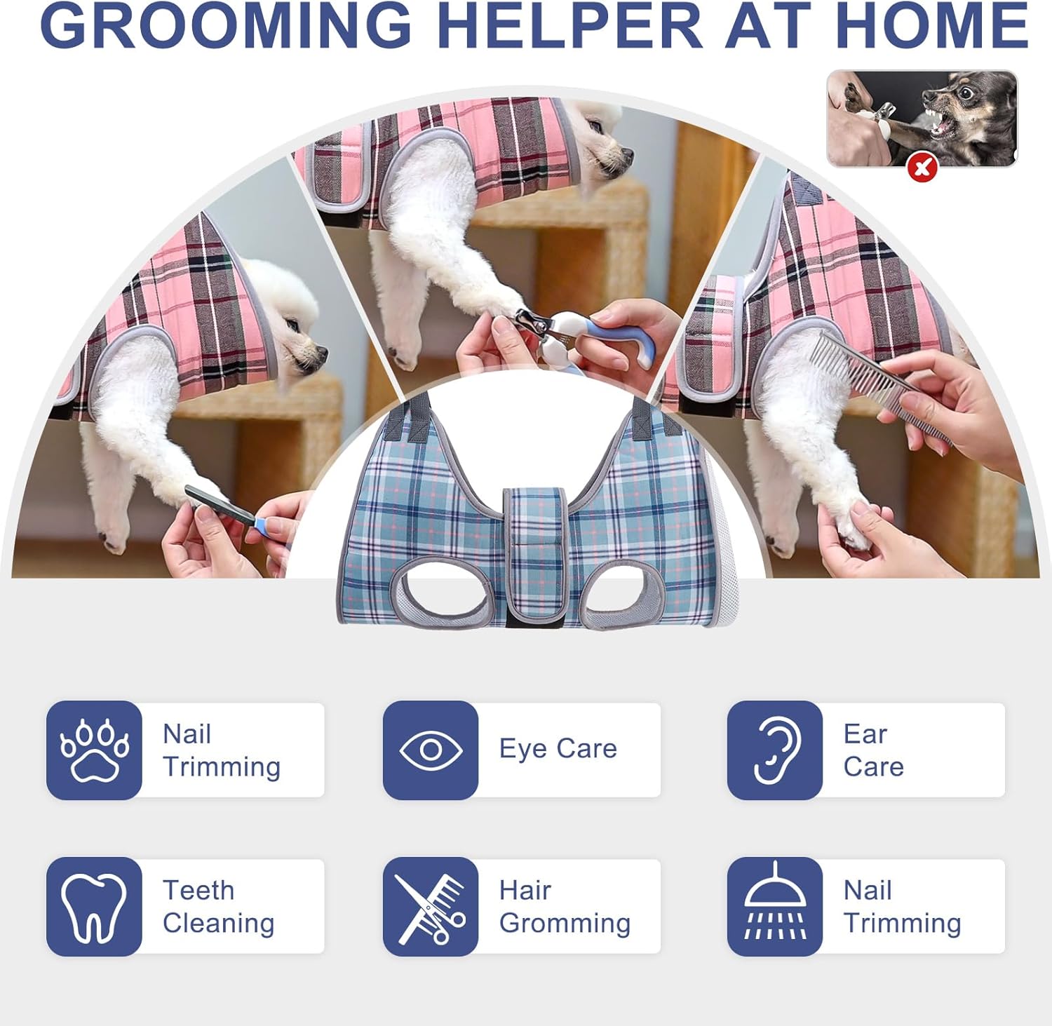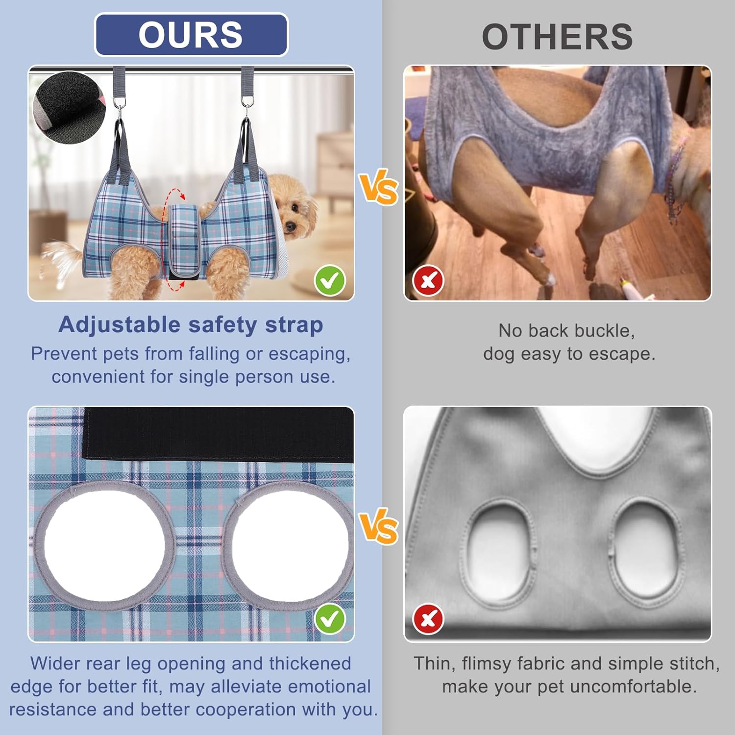 - Comfortable and Safe Hanging Dog Harness for Nail Trimming- 3D air mesh with thickened edges makes this pet grooming sling increase breathability and sturdiness. In addition, dog/cat restraint grooming bag has an Upgraded wider under body support & larger frontal chest/neck space, plus more spacious hind leg openings to keep back legs from pinching. Our Heavy-duty carabiners with better weight bearing, and are more durable secure than other S-hooks
