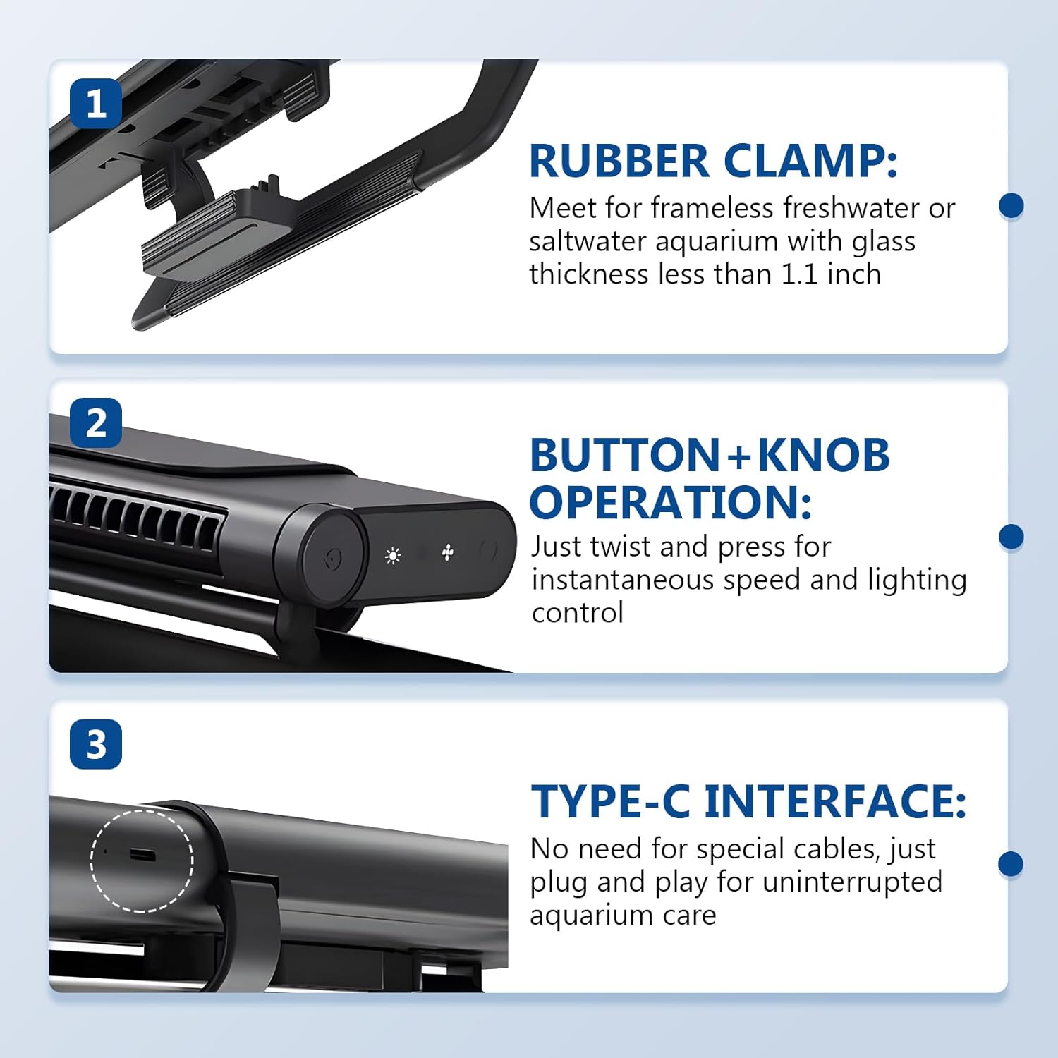- 3 Modes Lighting for Every Need: Aquarium cooling fan has bright white, warm white, and warm yellow with adjustable brightness . Use bright white for a clear view during feeding time, promote plant growth or closely monitor the health of fish. When it's time to unwind, switch to warm yellow to create a relaxing ambiance that doubles as a soft night light