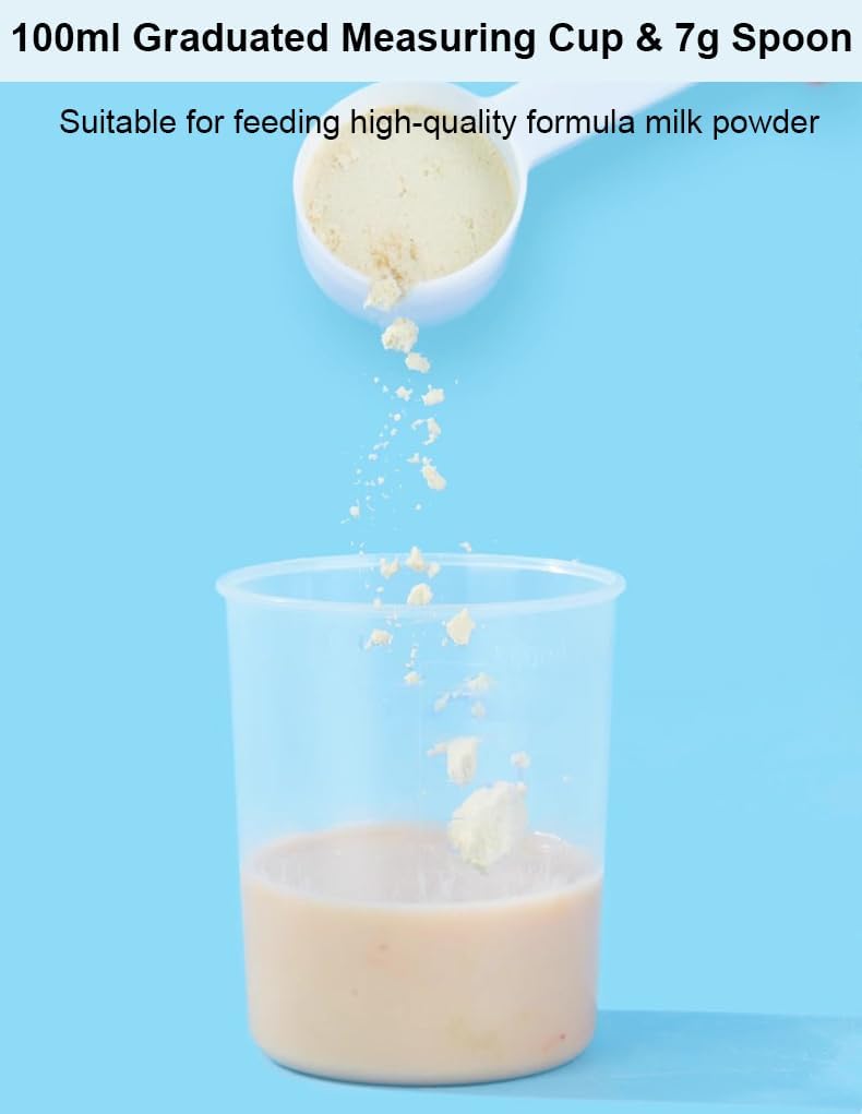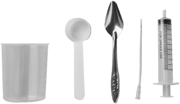 - Set of 5: Contains 10ml syringe, scoop of milk powder, 100ml measuring cup, stainless steel spoon, 8cm hoses.