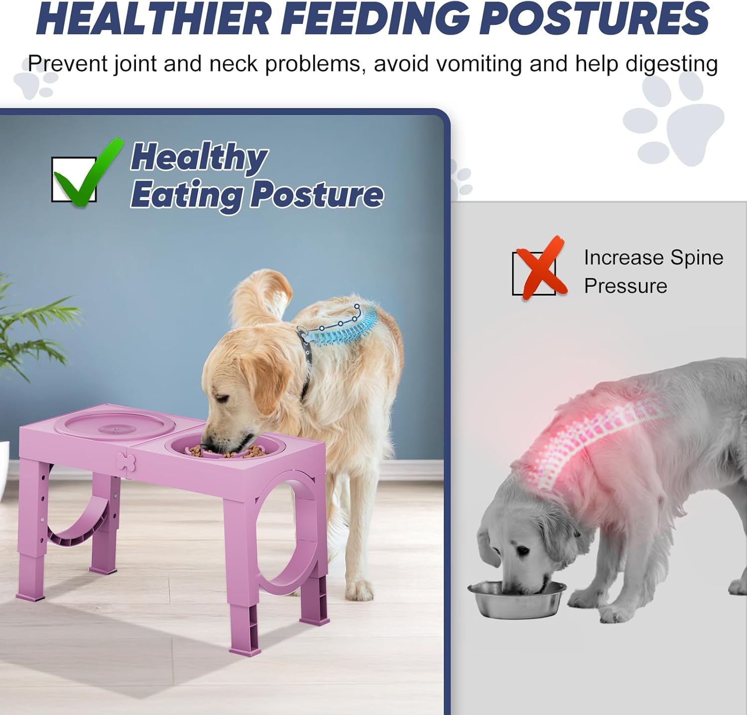 - Elevated Feeding Design: Ergonomically elevated bowl stand reduces strain on your dog's neck and promotes healthier digestion by aligning the eating posture. Reduces strain on neck and shoulders for comfortable eating. Helps prevent conditions like gastric torsion by aligning your dog’s spine during meals.