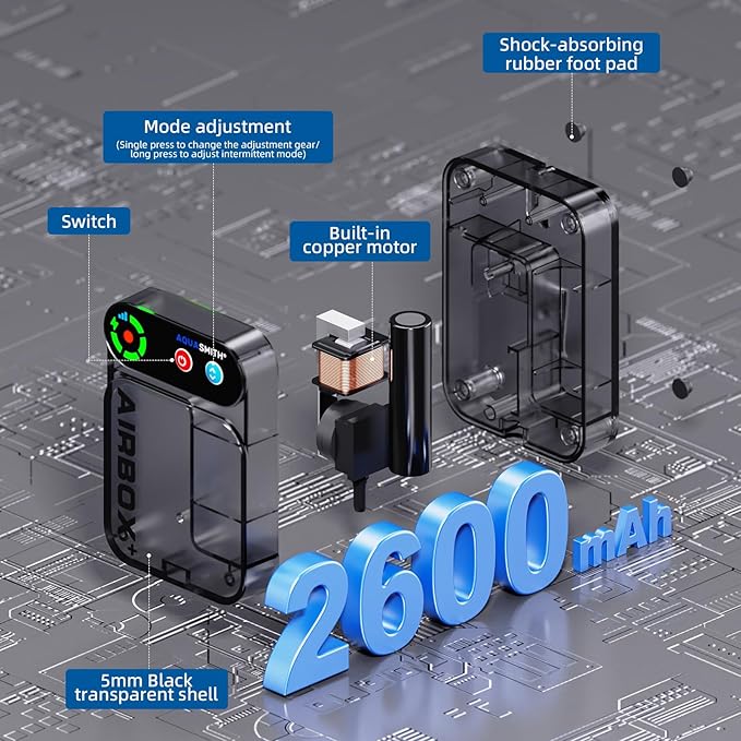 - 【Adjustable/Dual Modes】Features 4-speed airflow adjustment with smart dual-mode switching. This bait pump is equipped with a circular indicator light precisely show operation status, battery level, and airflow settings. intermittent mode reduces consumption, ideal for aquarium maintenance, portable bait containers, and long-haul transportation
