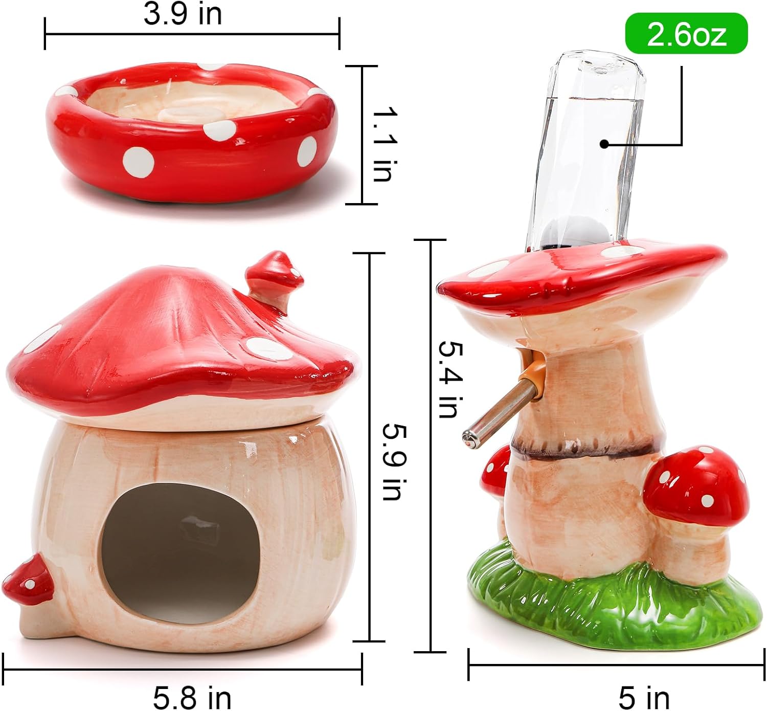- Nice Set: This ceramic mushroom-shaped set includes a hamster hideout, a food bowl, and a water bottle with stand, perfect for your furry friends to nest, feed, and drink water. It meets all basic habitat needs.