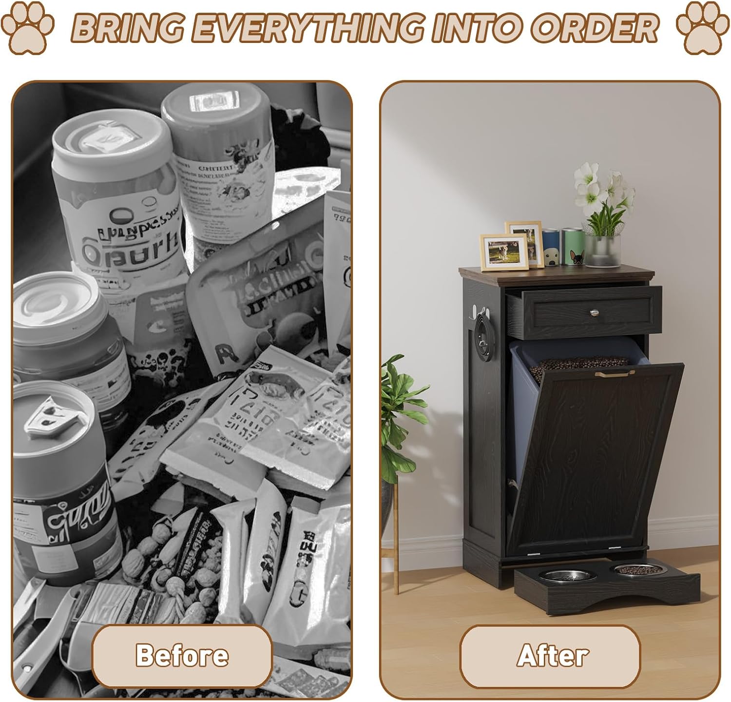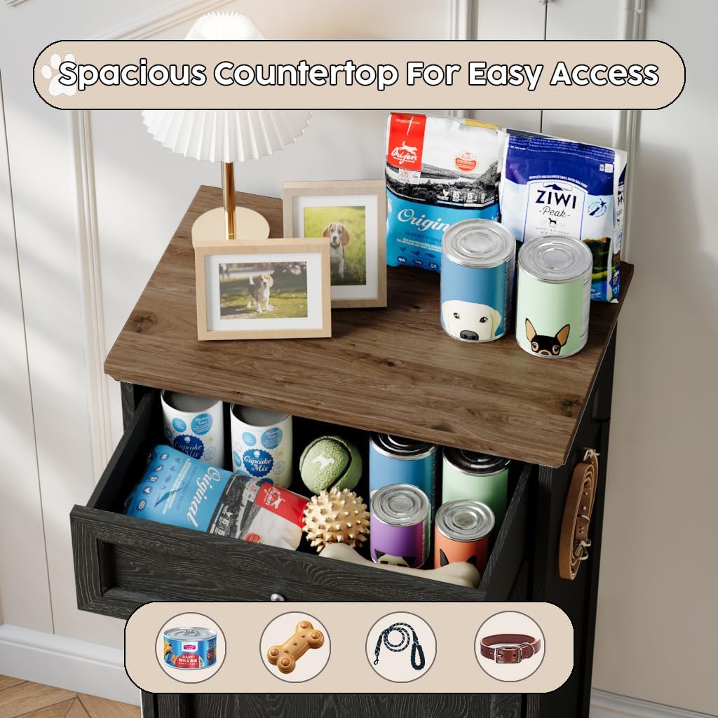 - Store Pet Supplies: Tilt out pet storage cabinet includes tilt out cabinet, and a spacious drawer and table top, can Store all your pet supplies. Meanwhile, it comes with hooks on the side can hold harnesses and leashes. The pull-out cabinet can store food bags. The shelf and countertop can save cans, pet toys, or treats.