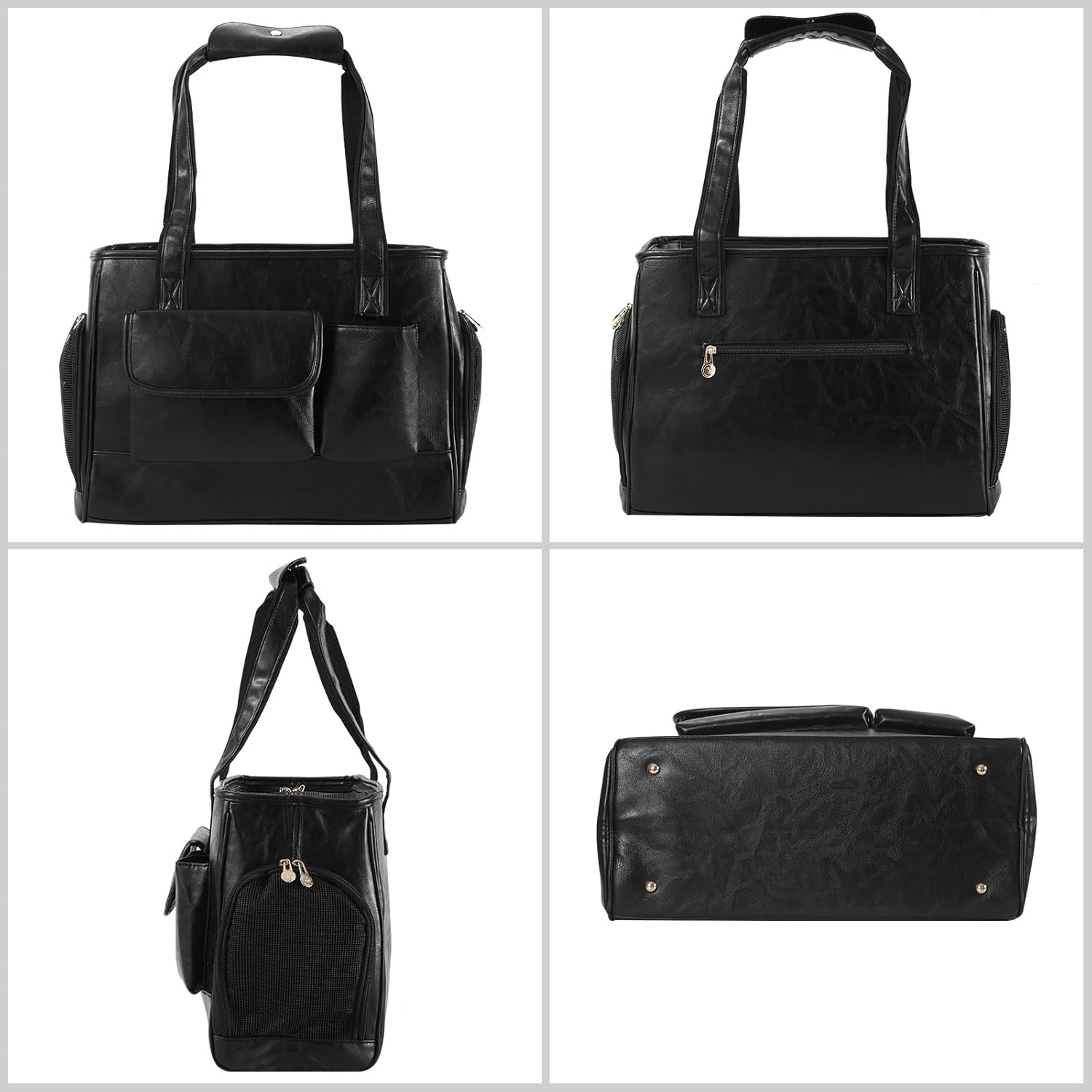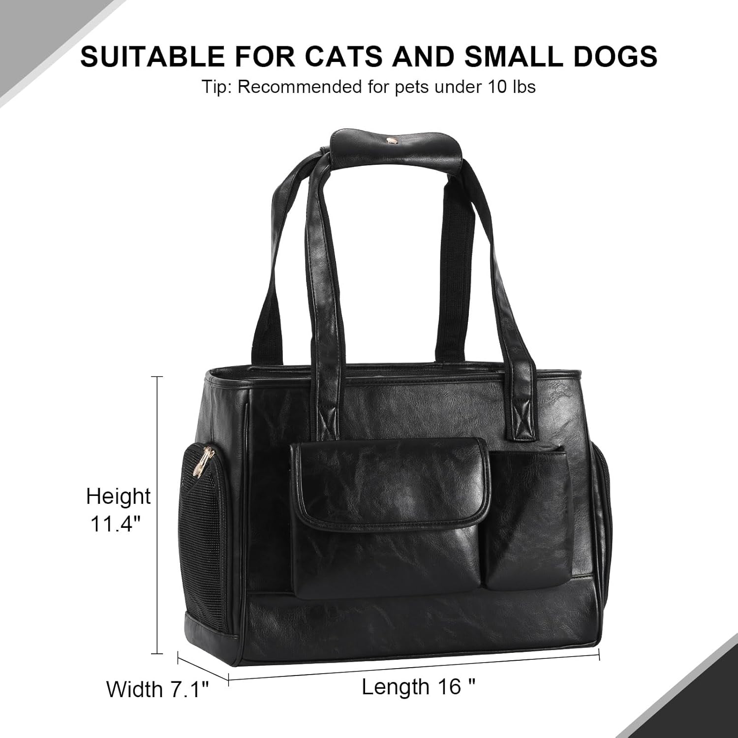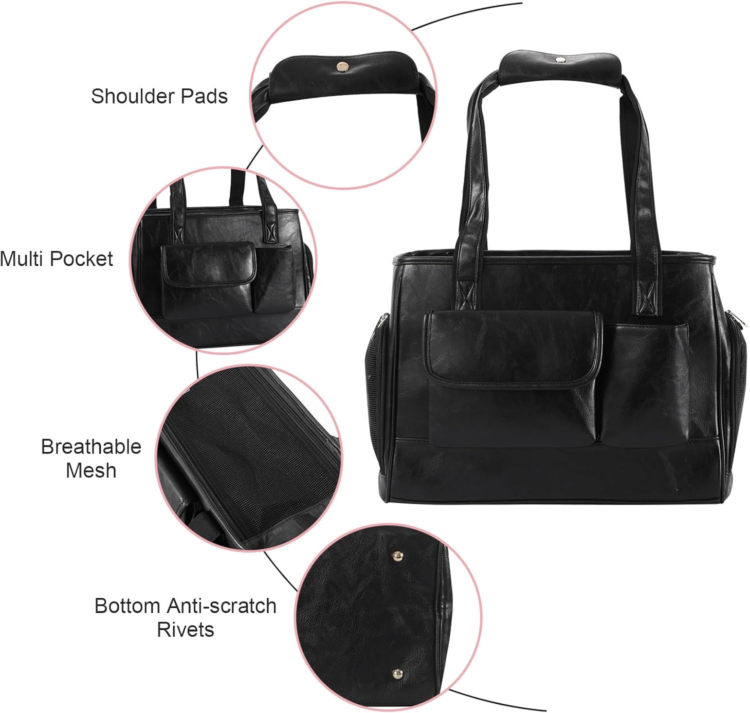 Dog Carrier Purse, Fashion Leather Pet Carrier Bag, Airline Approved Soft Sided Cat Travel Tote Bag with Pockets Black