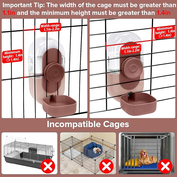 - Important Tip: The rabbit water bottle is suitable for metal wire pet cages and cage rods, with a width range of 1.1in-2.2in.The height of the cage gap shall not be less than 1.4in.Please Check out the pictures to confirm whether the cage is suitable and avoid being unusable.
