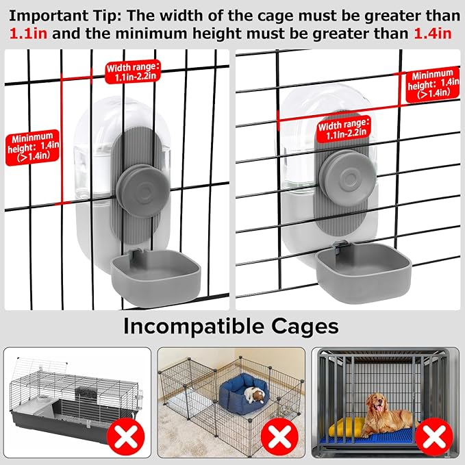 - Important Tip: The rabbit water bottle is suitable for metal wire pet cages and cage rods, with a width range of 1.1in-2.2in.The height of the cage gap shall not be less than 1.4in.Please Check out the pictures to confirm whether the cage is suitable and avoid being unusable.