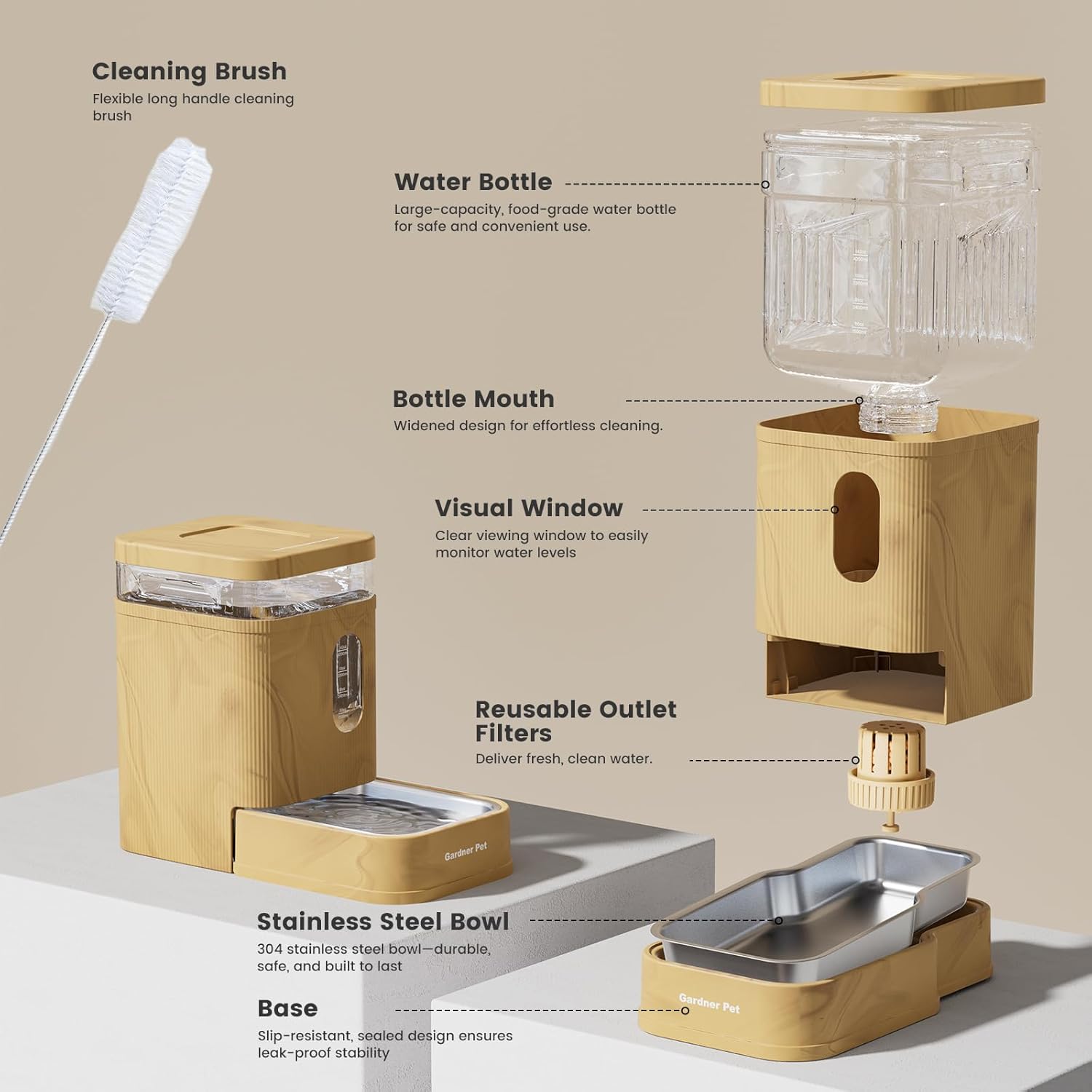 - Premium Pet-Safe Materials - Gardner Pert dog water bowl dispenser comes with 304 stainless steel bowl + cleaning brush guarantees a safe, easy-to-clean water supply for pets.