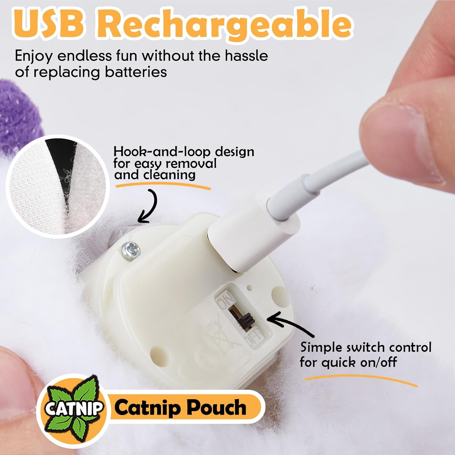 - 【USB Rechargeable & Intelligent】Our halloween cat toy is USB rechargeable with a long battery life. It's intelligently designed to pause every 15 seconds of inactivity, conserving energy. But don't worry, it springs back to life as soon as your cat interacts with it