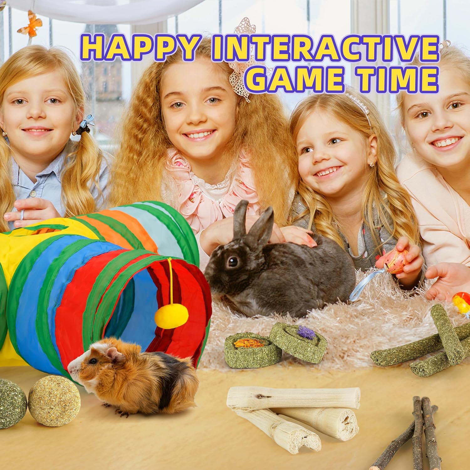 - 【13pcs Bunny Toys for Grinding Teeth】: Tunnel, grass sticks and balls, apple sticks, bamboo, and different type of toys to keeps bunnies entertained while promoting dental health & stops destructive chewing.