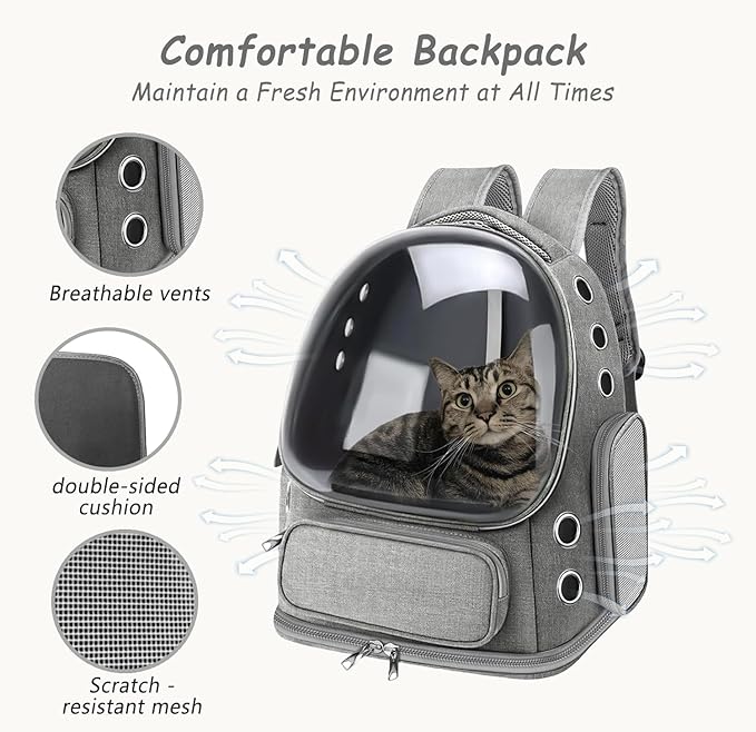 - VENTILATED BUBBLE BACKPACK: The cat backpack is designed with clear bubble windows so you can watch your cat's every move inside the backpack. The backpack also features 10 vents to ensure a constant flow of fresh air inside the backpack, allowing your cat to breathe well. In addition, the cat backpack comes with a grooming tool to restore your pet's coat to a smooth, healthy, tangle-free condition!