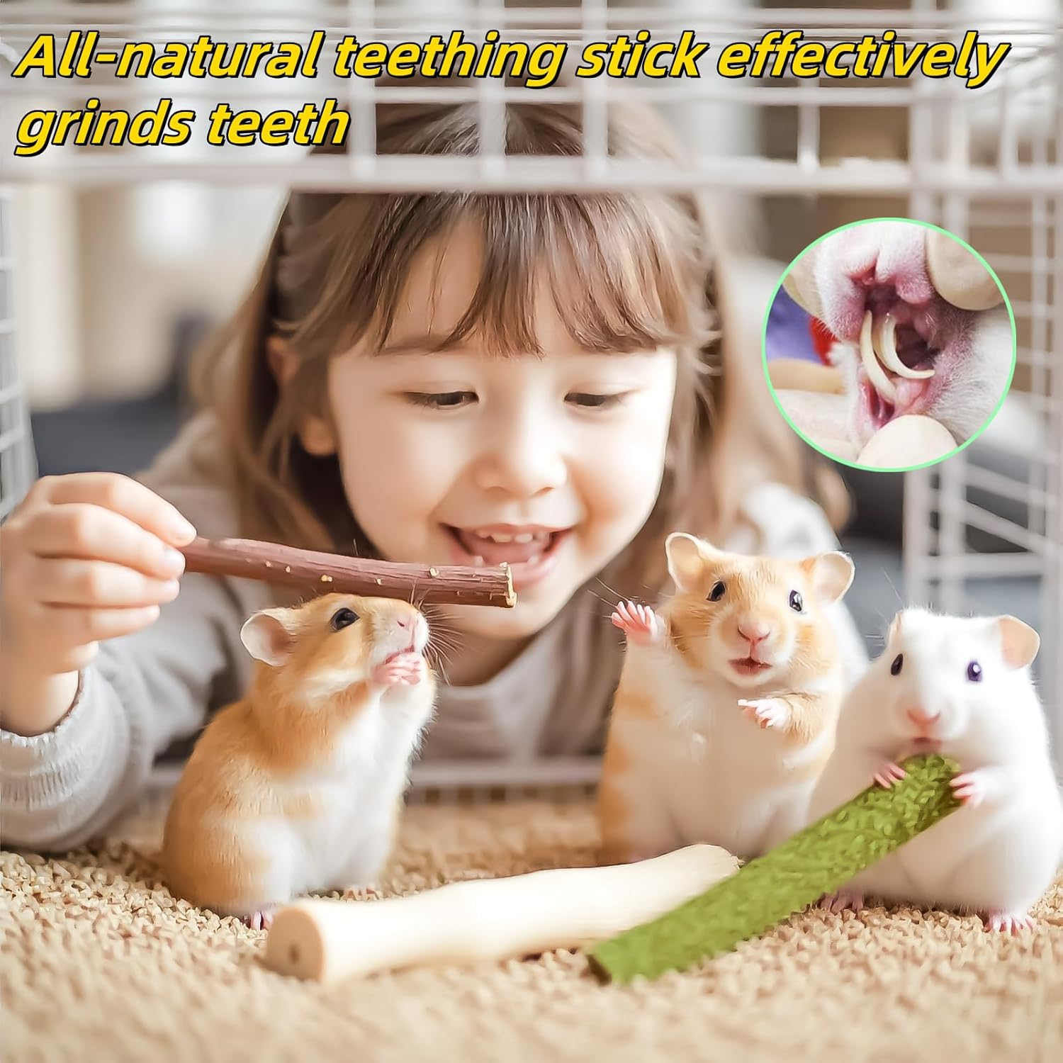 - 【4-in-1 Rabbit Chew Toy &Treats】Rabbits chew toy include 4 different flavors of apple stick, sweet bamboo, timothy hay stick and alfalfa. Chewing timothy stick is deeply loved by rabbits, guinea pigs, hamsters,chinchillas,squirrels. Apple molar sticks have an irresistible taste for bunny, sweet bamboo promotes grinding and timothy hay helps with digestion and intestinal health. Bunnychewing treats is a smart 2 in 1 solution for pet rat parents-no need to buy separate hamster toys and snacks.