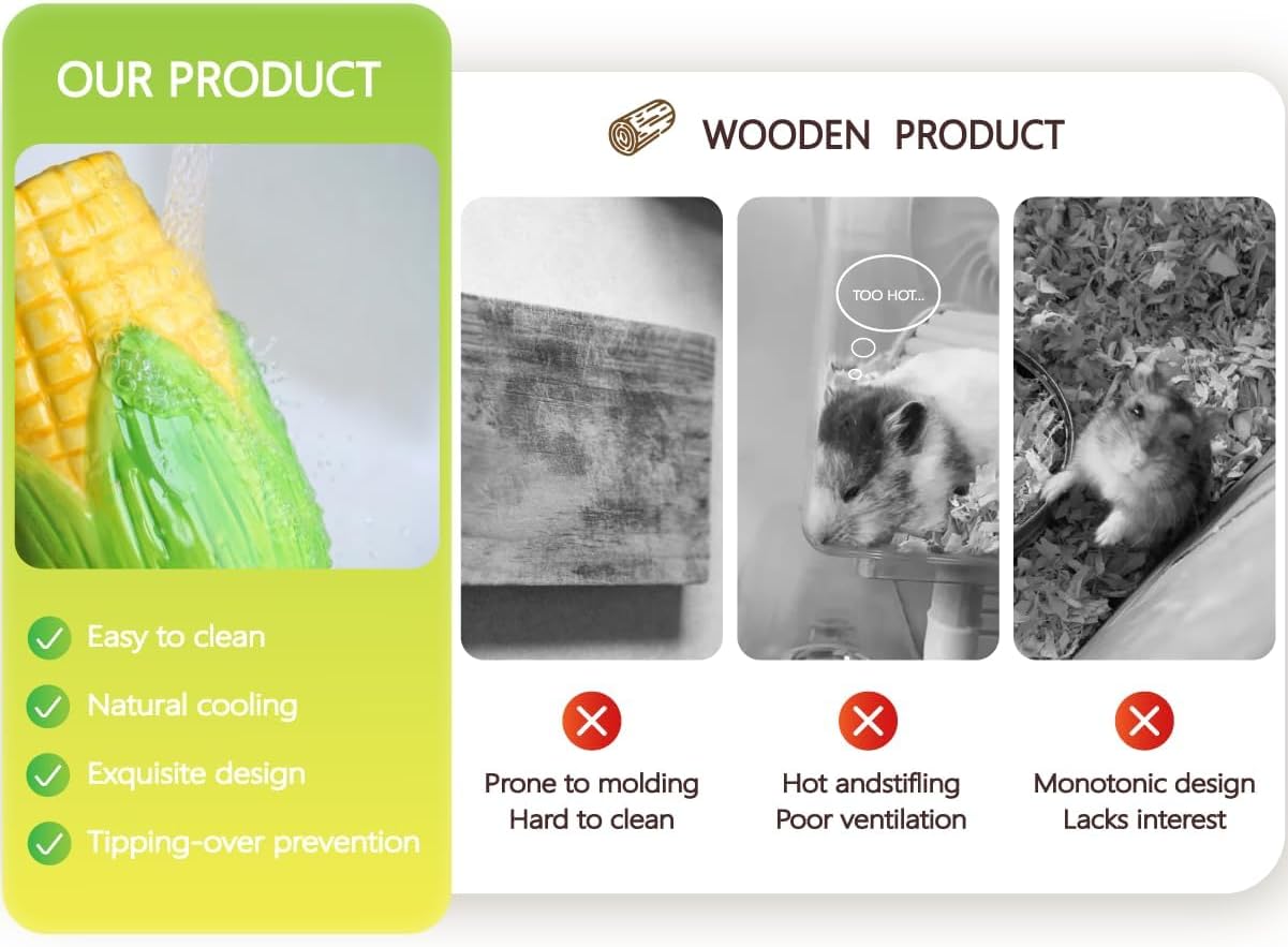 - Adorable Corn Design – Bright, lifelike corn-shaped water bottle and bowl set adds a playful, natural vibe to your hamster's habitat. Perfect for themed cages or enriching your pet’s environment!