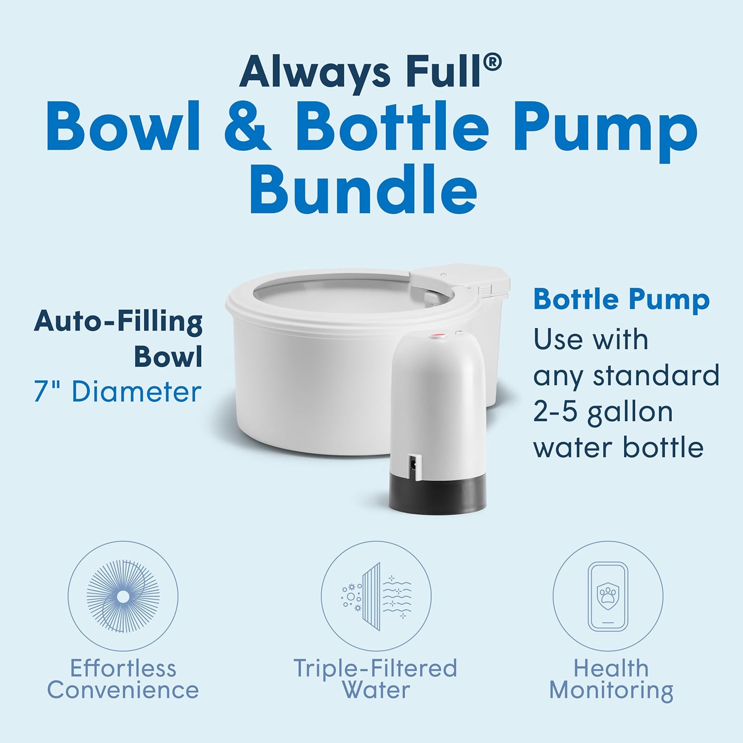 Always Full® 7" Pet Water Bowl and Bottle Pump Bundle, Self-Refilling, Clean Filtered Water, App-Enabled Hydration Monitoring, Easy Upgrade to Wall Unit, Cat and Dog Water Bowls
