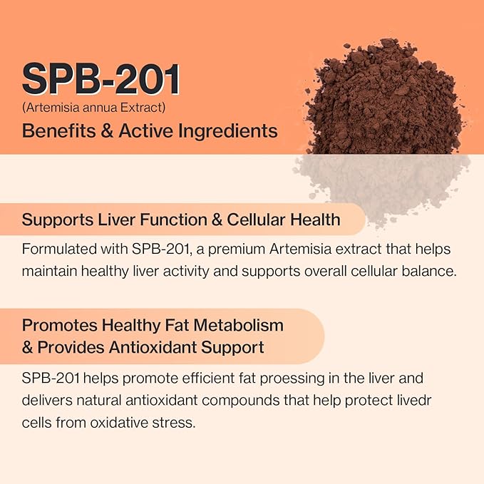 - Powered by Artemisia annua (SPB-201) – nature’s antioxidant hero: Our formula features SPB-201, a premium extract of Artemisia annua (Sweet Wormwood), known for its powerful antioxidant and hepatoprotective properties. SPB-201 helps defend liver cells from oxidative stress and supports the body’s natural detoxification process, making it a key ingredient for long-term liver health.