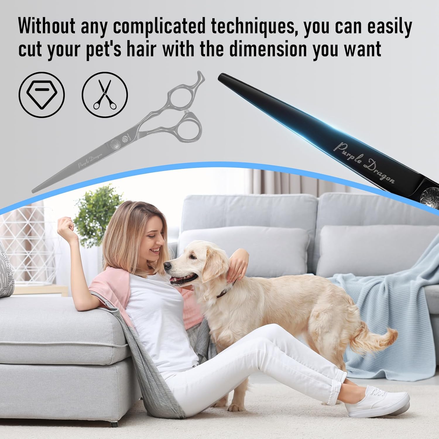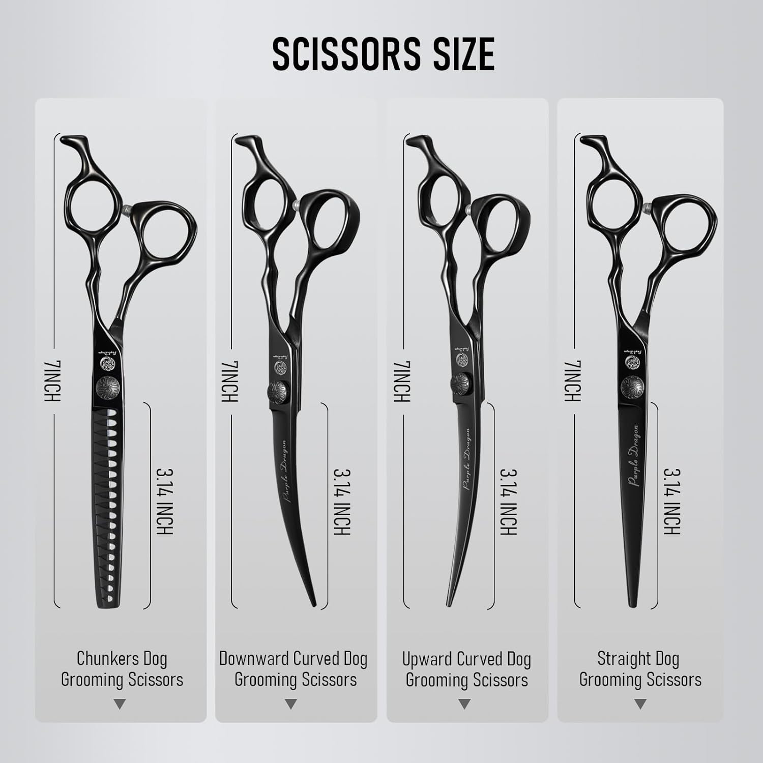 Purple Dragon Dog Grooming Scissors Set - Chunkers, Straight, Up & Down Curved Scissors and Comb, 7 Inch Black Shears with Adjustable Screw for Dogs and Cats