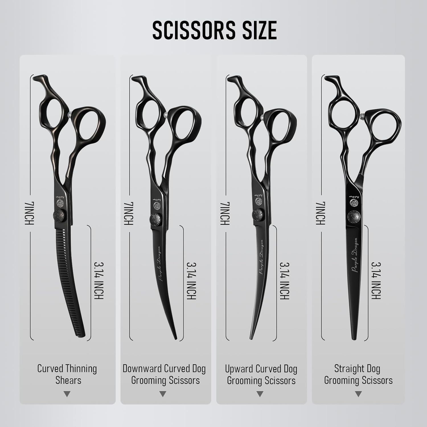 Purple Dragon Dog Grooming Scissors Set - Curved Thinning, Straight, Up & Down Curved Scissors and Comb, 7 Inch Black Shears with Adjustable Screw for Dogs and Cats