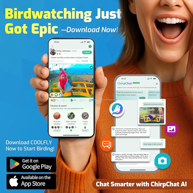 - Discover the World’s First Interactive Birding Experience: RichBird smart bird feeder Paired seamlessly with the groundbreaking CoolFly app, it transforms birdwatching into a vibrant, social adventure. Connect with a passionate community: share captivating videos, exchange likes and comments, Delve into CoolFly’s comprehensive bird database, featuring detailed species profiles, authentic calls, dietary insights, and more