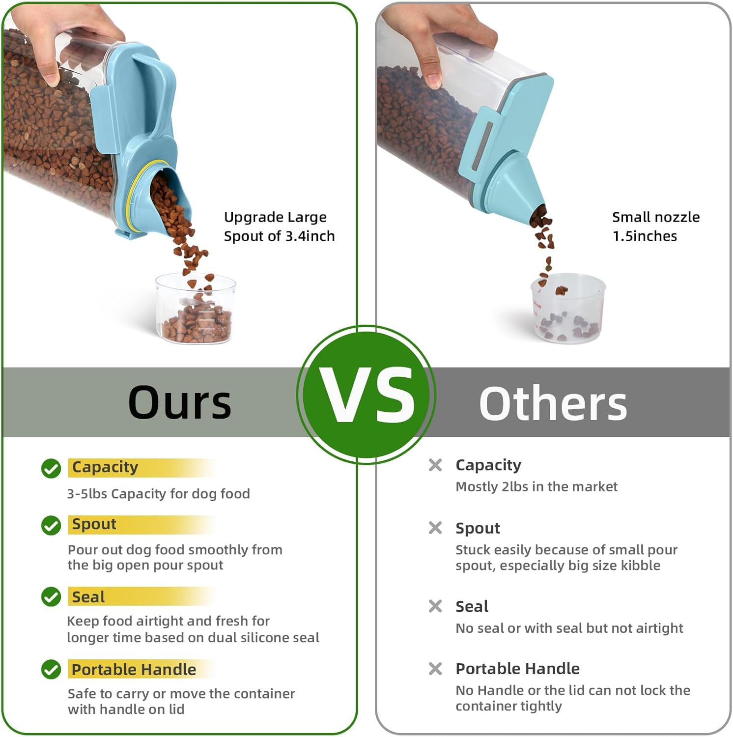 - Upgraded and Lmproved Versions:We have optimized and improved the mold the pour spout is large enough to pour out the big dog Food,You can pour out the food easy and fast now. The new upgraded Measuring Cup is also easy to screw on the spout now.The lid with snaps can also be easily closed on the barrel body.