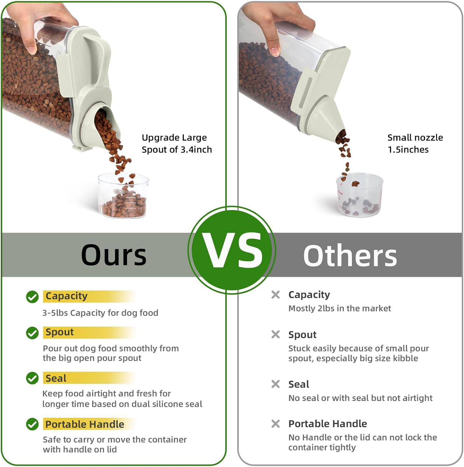 - Upgraded and Lmproved Versions:We have optimized and improved the mold the pour spout is large enough to pour out the big dog Food,You can pour out the food easy and fast now. The new upgraded Measuring Cup is also easy to screw on the spout now.The lid with snaps can also be easily closed on the barrel body.