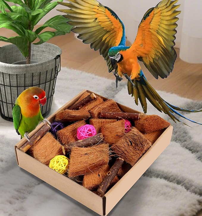 - 🌿 Mental & Physical Enrichment Our multi-texture combo (coconut husk/ropes/wooden beads/applewood/wicker balls) stimulates bird natural foraging instincts for hours of focused play. Proven to prevent: Bird Cage boredom Stress-induced bird feather plucking Anxiety screaming