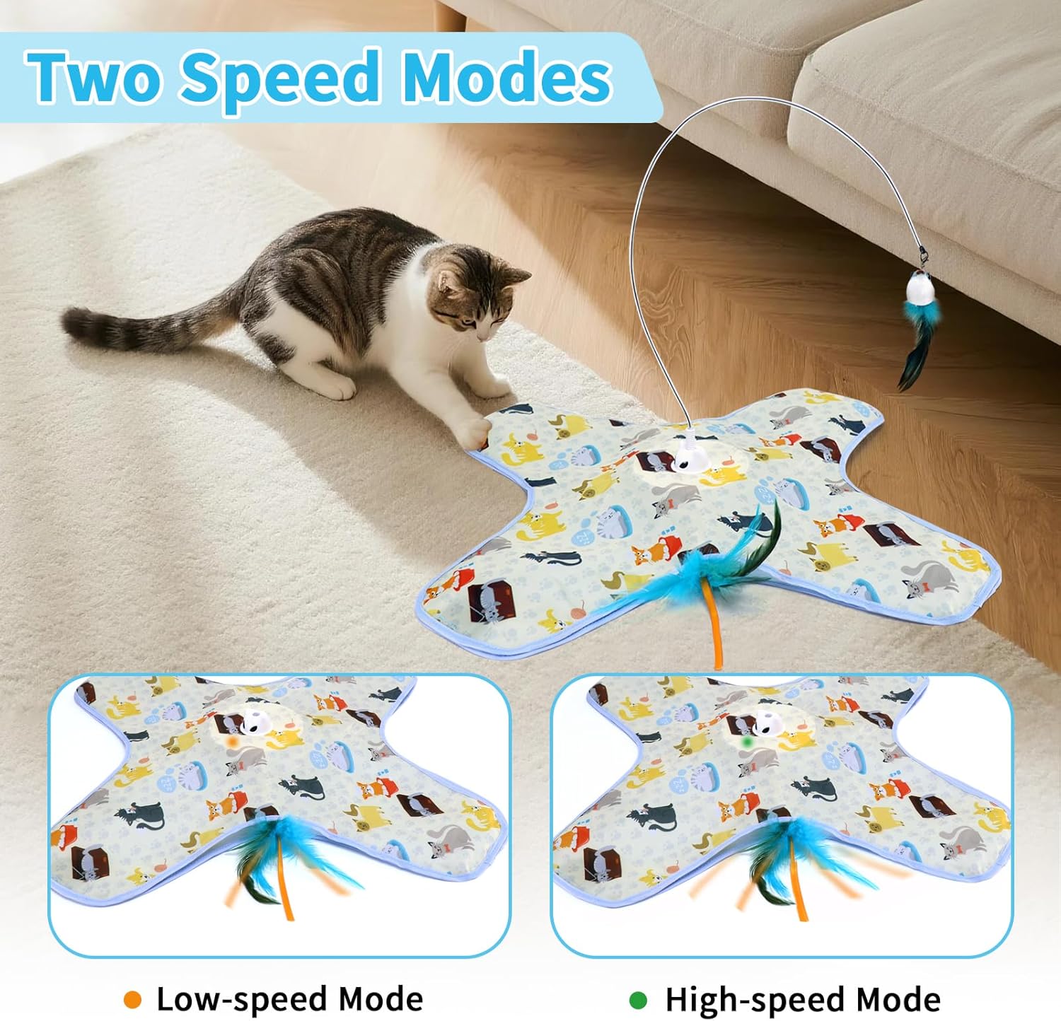 - 2 Speeds Available and Quiet to Operate: This indoor cat toy has 2 speed modes (slow, fast) to meet the movement needs of different cats And the operation is quiet, without mechanical noise, able to withstand the intense play of cats, and can also bring you a peaceful daily life.