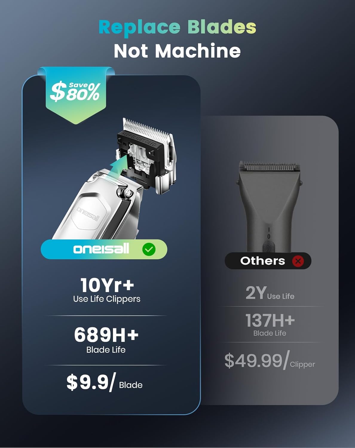 - Stays Razor-Sharp Through Multiple Cuts: oneisall dog clippers are made of high hardness, corrosion-resistant stainless steel blade, which can be used continuously for 9,000+ times, which saves you the cost of frequent replacement of the blade! No Snagging, No Pulling, give your pet a better shaving experience! Innovative detachable blade design, no place for hair debris to hide, super easy to clean and maintain!