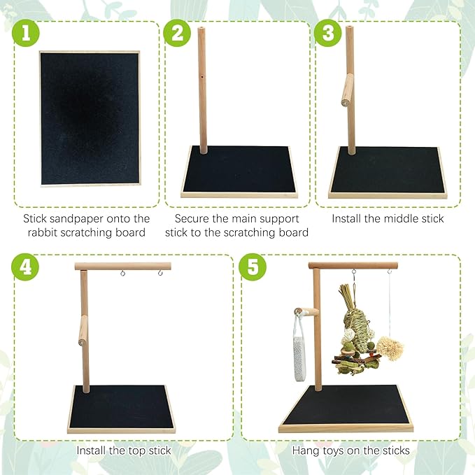 - Rabbit Toys Set: You will receive a wooden rabbit scratching board, two black sandpaper, a corn leaf ball toy, four wooden sticks, a grass-woven carrot chew toy, a tooth-grinding stone, and a screwdriver for installation