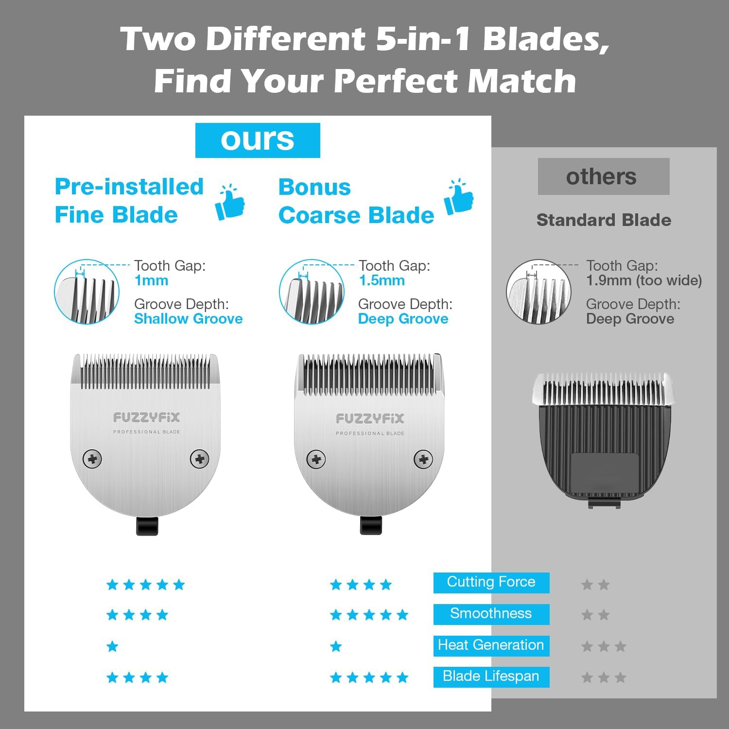 - 【Two 5-in-1 Blades Clippers Kit】 Includes two detachable 5-in-1 blades (1× pre-installed 1mm fine blade + 1× bonus 1.5mm coarse blade,adjust 0.8-1.2mm) and a complete metal accessory set: 8 guide combs (3-25mm), adapter, USB-C cable, brush, care oil, and storage case.