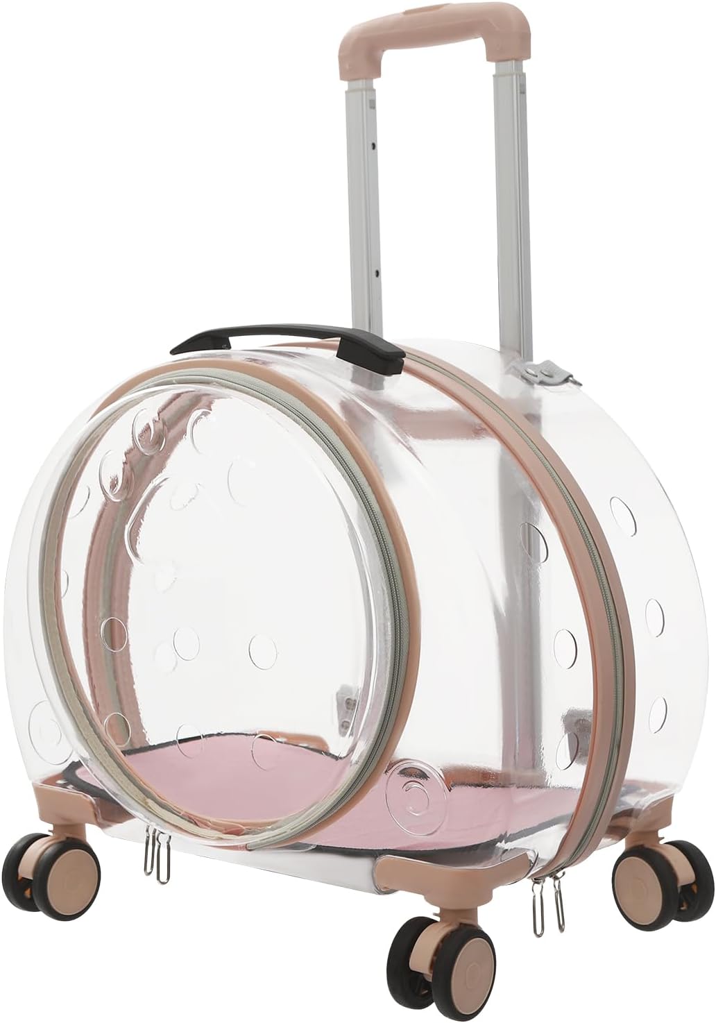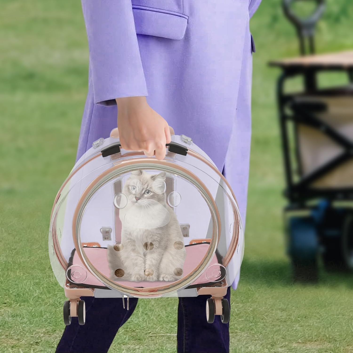 Cat Backpack Carrier, Transparent & Fully Breathable Hard cat Carrier with Rolling Wheels for Kitty Small Dog up to 19lbs, Multiple Carrying Options, Perfect for Travel Hiking, Pink, Clear