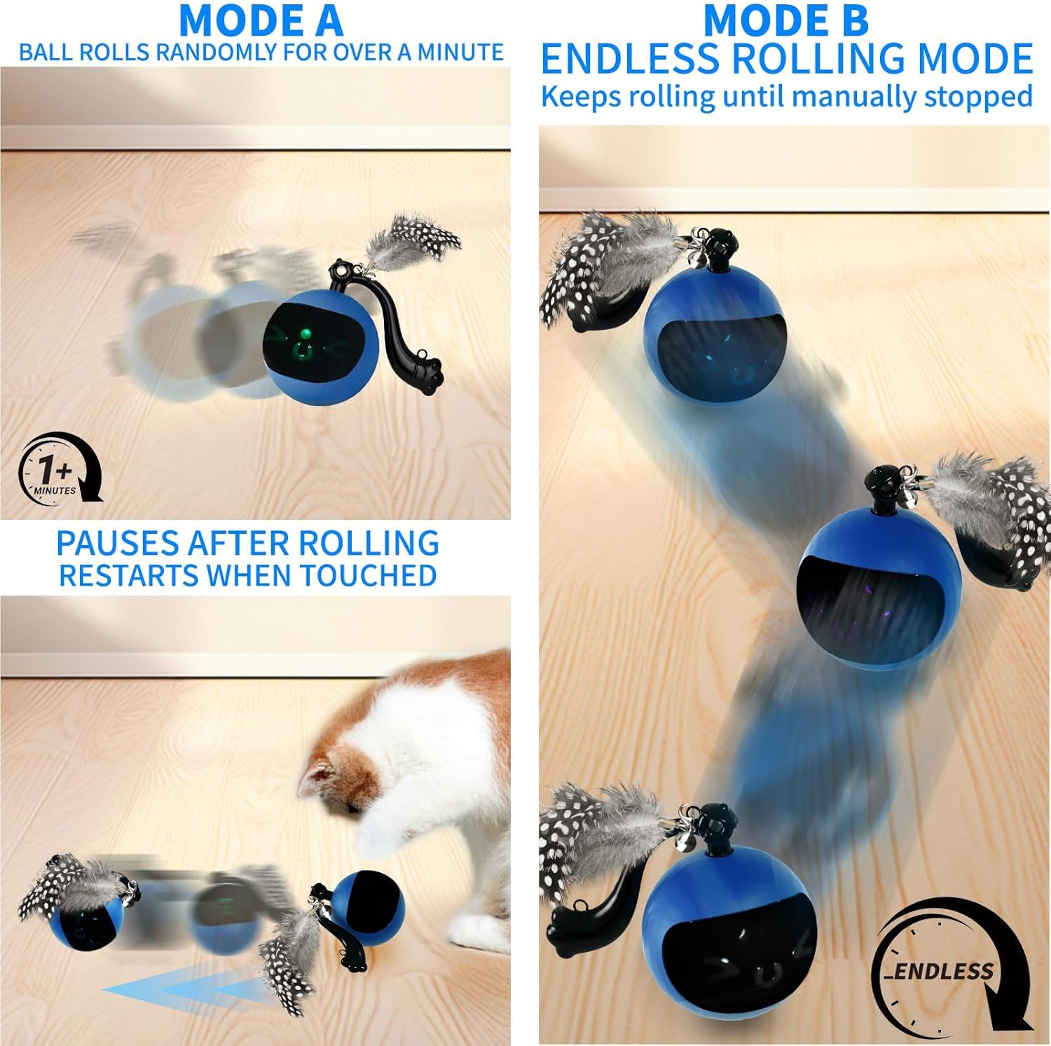 - AUTOMATIC CAT TOY: When activated, the interactive cat toys for indoor cats randomly rolls for just over a minute, then automatically pauses. If touched during the pause, it starts another one-minute rolling cycle. For continuous rolling, press button on remote control to keep it rolling until is pressed again to stop it