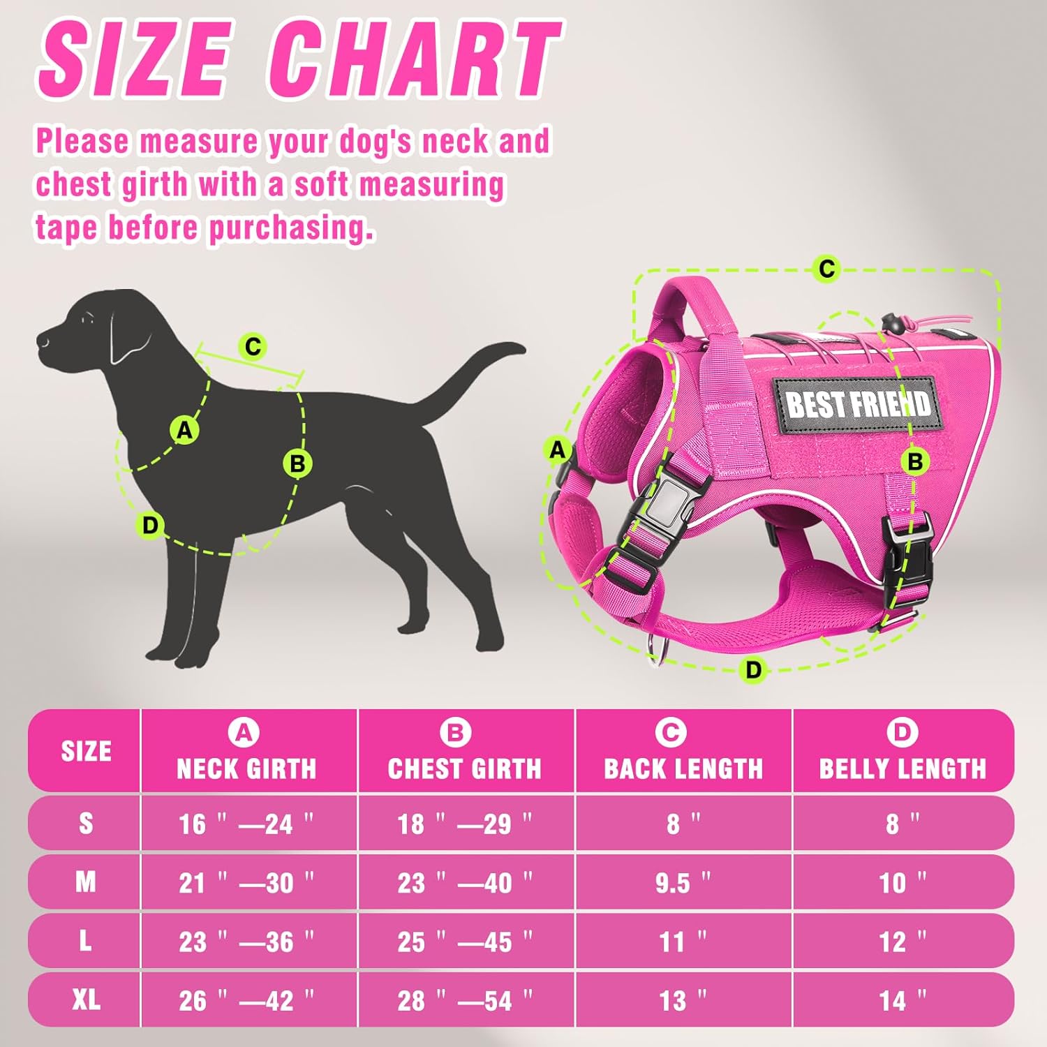 - Size Instruction: Dog vest harnesses are available in S, M, L, and XL 4 sizes. Perfectly fit for professional K9 training, hiking, and walking for German Shepherds, Labrador, Doberman, Retrievers, etc. Extra-Large chest girth:28"-54", neck girth:26"-42". Please choose the right size based on the size chart.