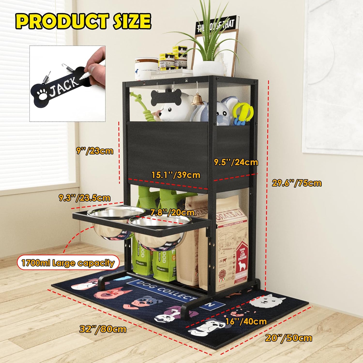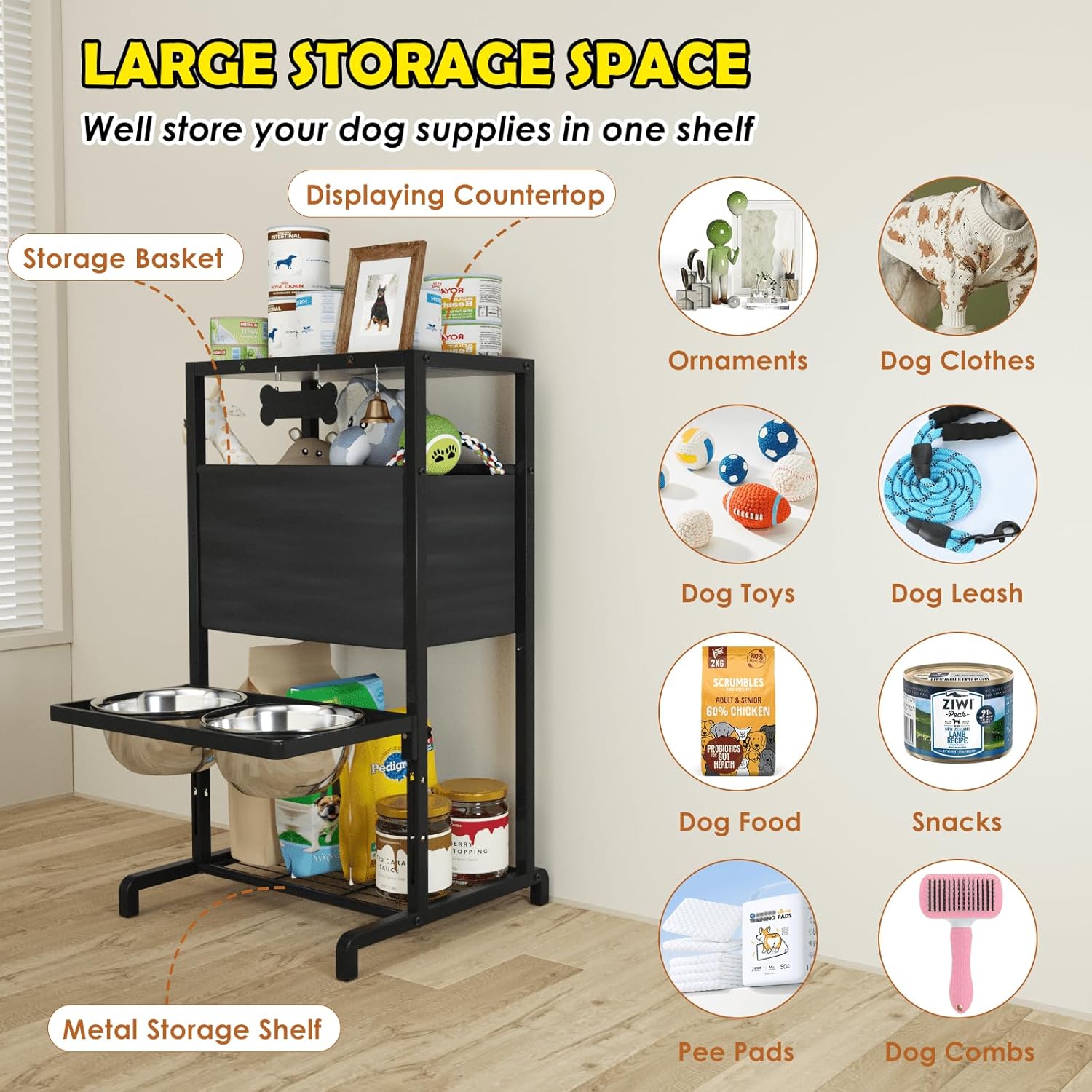 - 【HIGH RACK DOG BOWL WITH BUILT-IN STORAGE】 This innovative dog bowl stand combines a feeding station, countertop, storage shelf and toy box in one convenient unit. It provides ample space to store your dog's supplies, food, snacks, toys, etc. in an organized manner.