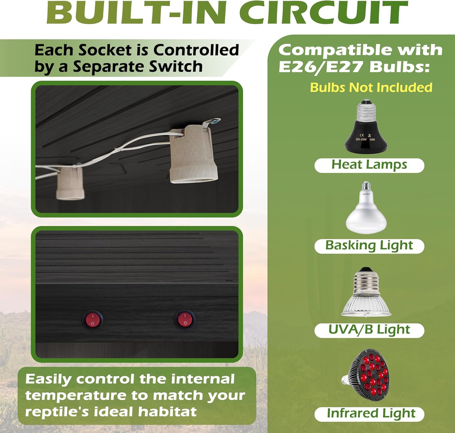 - 【Built-In Lighting System】The integrated electrical system includes built-in lamp holders—2 holders for 24"/32" models and 3 for 40"/48" models—each equipped with its own independent switch, saves money setting up the light fixture. Compatible with standard E26/E27 bulbs (not included), this setup gives you full control over lighting and temperature to create the perfect environment for your reptile's specific needs, and say goodbye to tangled wires, one wire control the whole cage.