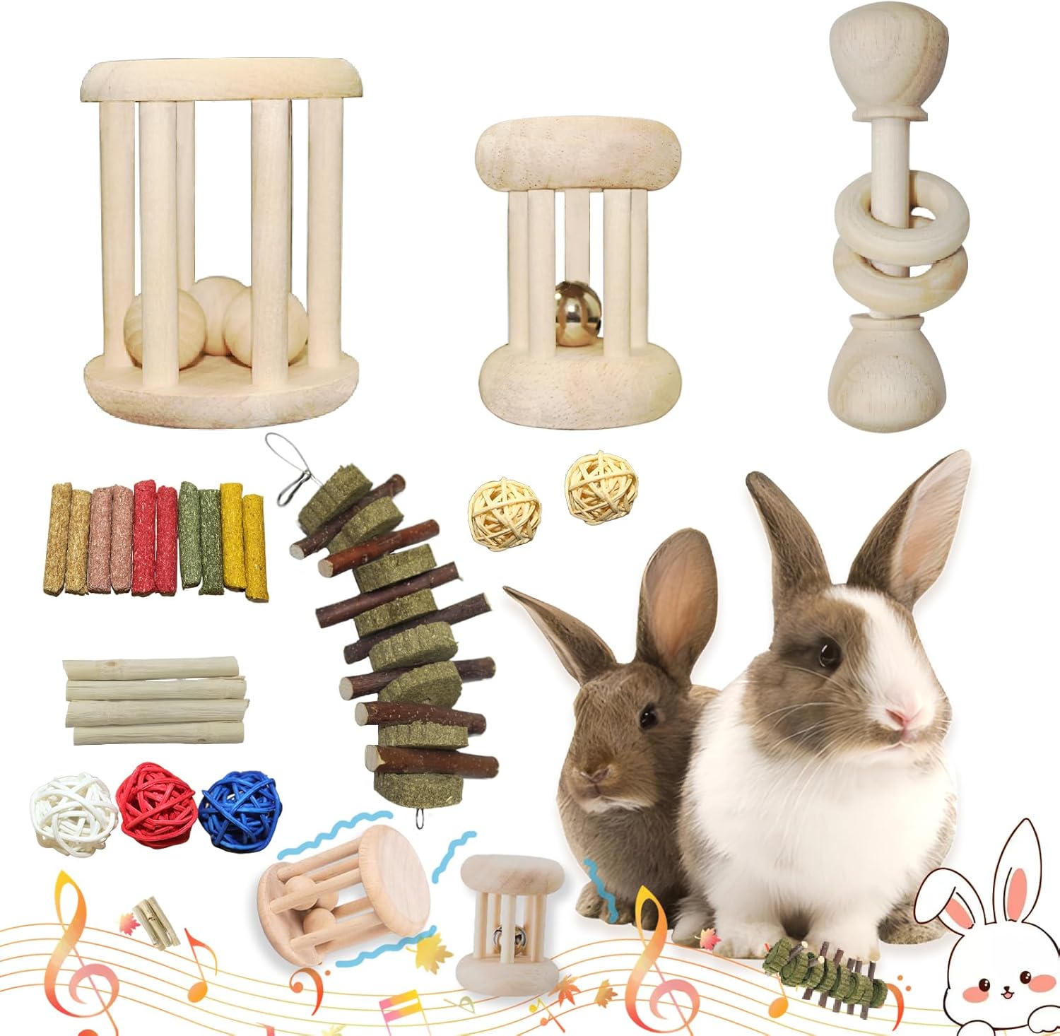 - 【23 PCS SET】3x Natural Wooden Bunny Toys,4x Snacks Sweet Bamboo,1x Natural Apple Wood Timothy Grass Cake Treats,10x Timothy Grass Sticks, ,5x Rattan Balls