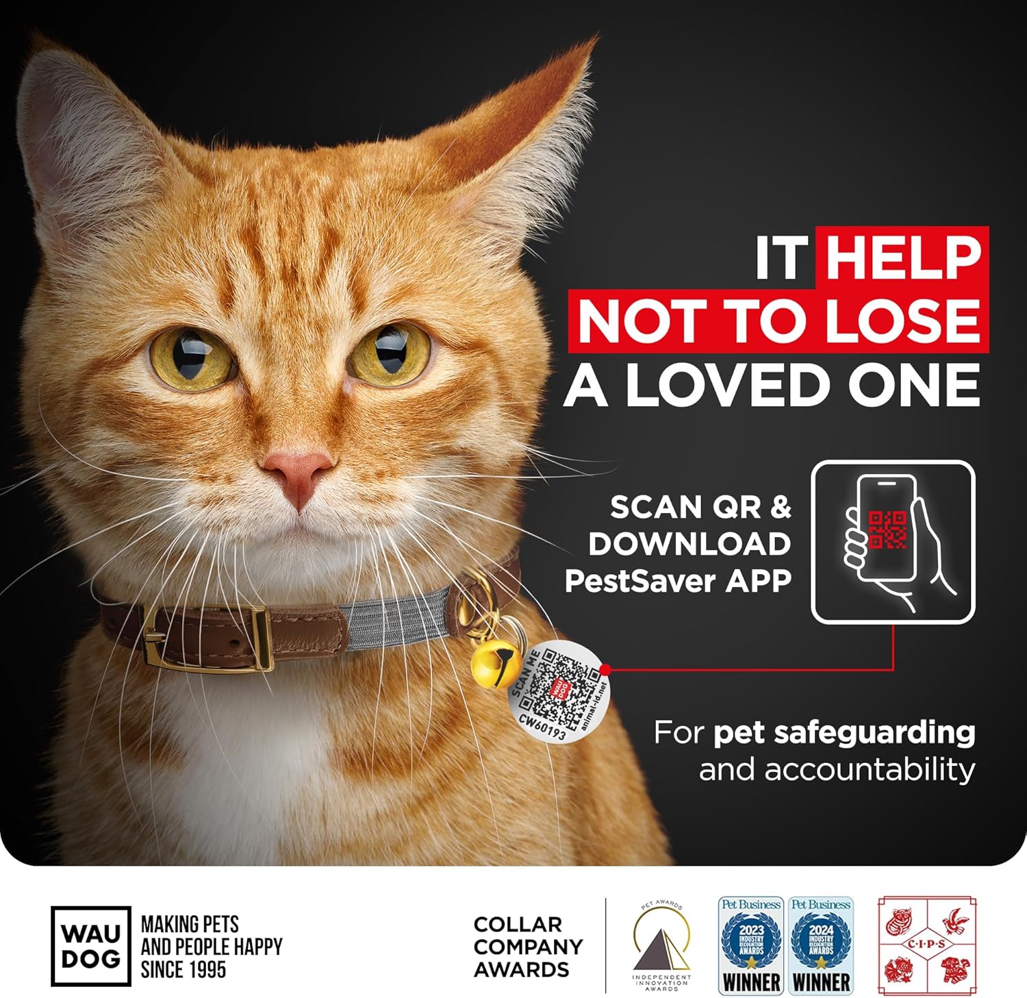 WAUDOG Ultra Soft Rolled Leather Cat Collar with Removable Bell, Safety Elastic Strap and QR ID Tag - Soft Padded for Small, Medium, and Large Cats - Round Kitten Collar for Male and Female Cats