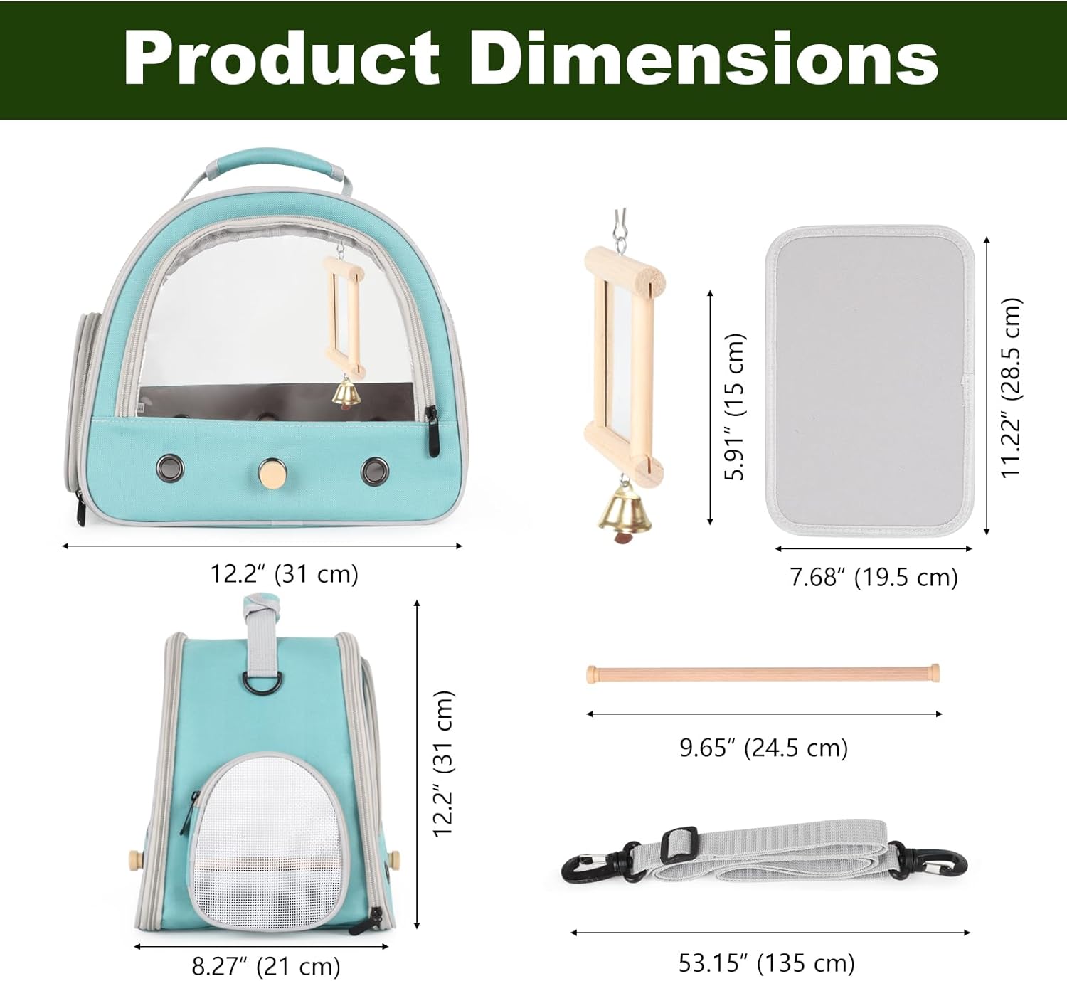 - Package includes 1 bird carrier + 1 support mat + 1 wooden standing perch+1 Bird mirror with bell toy