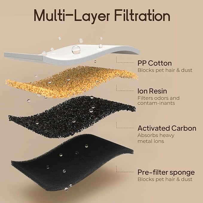 - 【Advanced Quadruple Filtration System】Our wireless pet water fountain features a vertical filtration system designed to consistently provide clean, fresh, and healthy hydration for your pet. This advanced four-layer system effectively removes impurities and odors, softens the water, and improves its taste. By reducing the risk of urinary and gastrointestinal issues, it ensures your furry friend enjoys pure and refreshing water every time they drink.