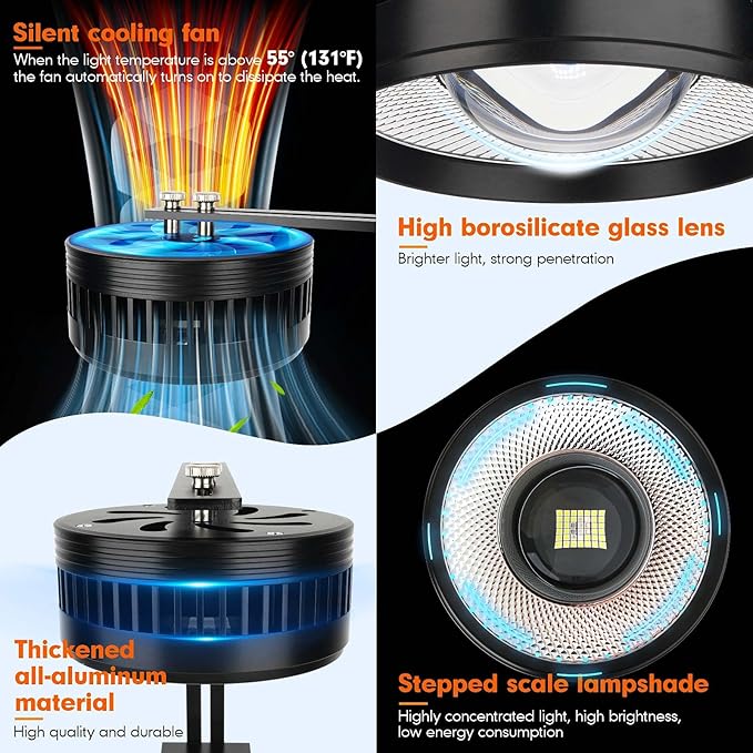 - Auto Cooling & Durable Build:Built-in fan activates at 131°F (55°C) to prevent overheating ensures long-lasting performance; Stepped Fin Reflector design concentrates light for deep water penetration; High-borosilicate glass lenses ensure crisp, deep light penetration for thriving plants and clear water.