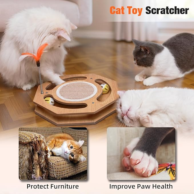 - 3-in-1 Interactive Cat Toy: Looking for a toy that satisfies your cat’s scratching and hunting instincts? This all-in-one cat toy combines a sisal scratching pad, feather teaser, and a track with moving bell balls—keeping your cat entertained and active for hours.