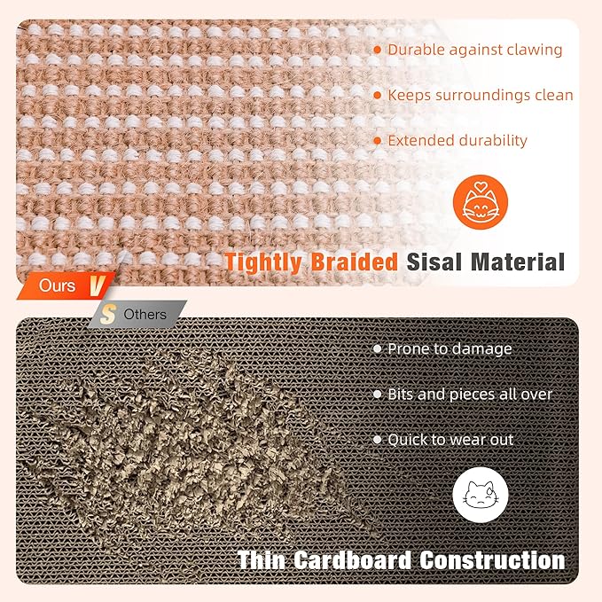- 100% Natural Sisal: The scratching pad for indoor cats is made from high-quality natural sisal, offering a durable and mess-free alternative to cardboard. It supports healthy claw maintenance and helps protect your furniture from damage.