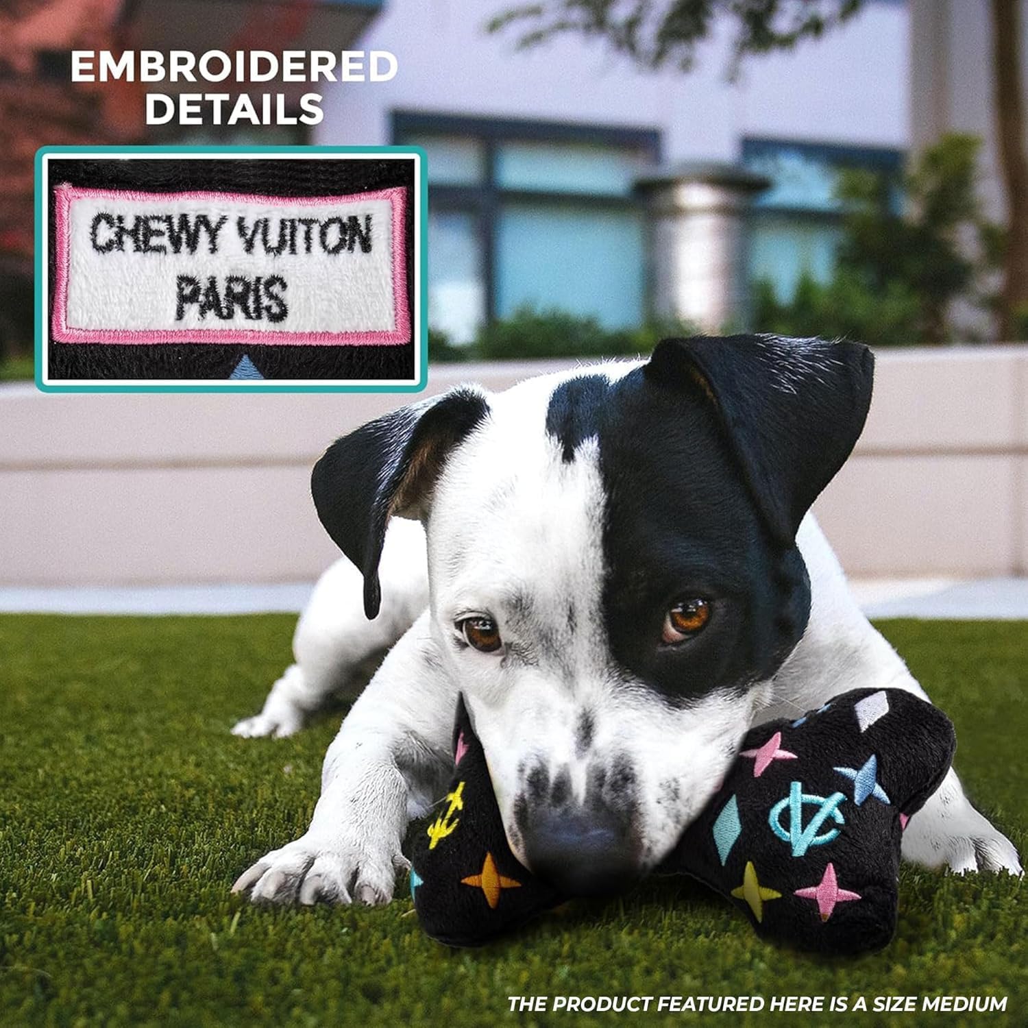 - Funny Parody Plush Dog Toy: Let your furry fashionista fetch some fashion-forward fun with this 4-pack plush dog toy bundle featuring Medium Chewy Vuiton Bones in stylish iconic patterns: Taupe & Cream Checker, White with Multi-Color Monogram, Pink Ombre with White Monogram, and Black with Multi-Color Monogram. Each toy has a soft plush exterior with a hidden squeaker inside. It’s a playful, cute squeaky dog toy that combines style & fun
