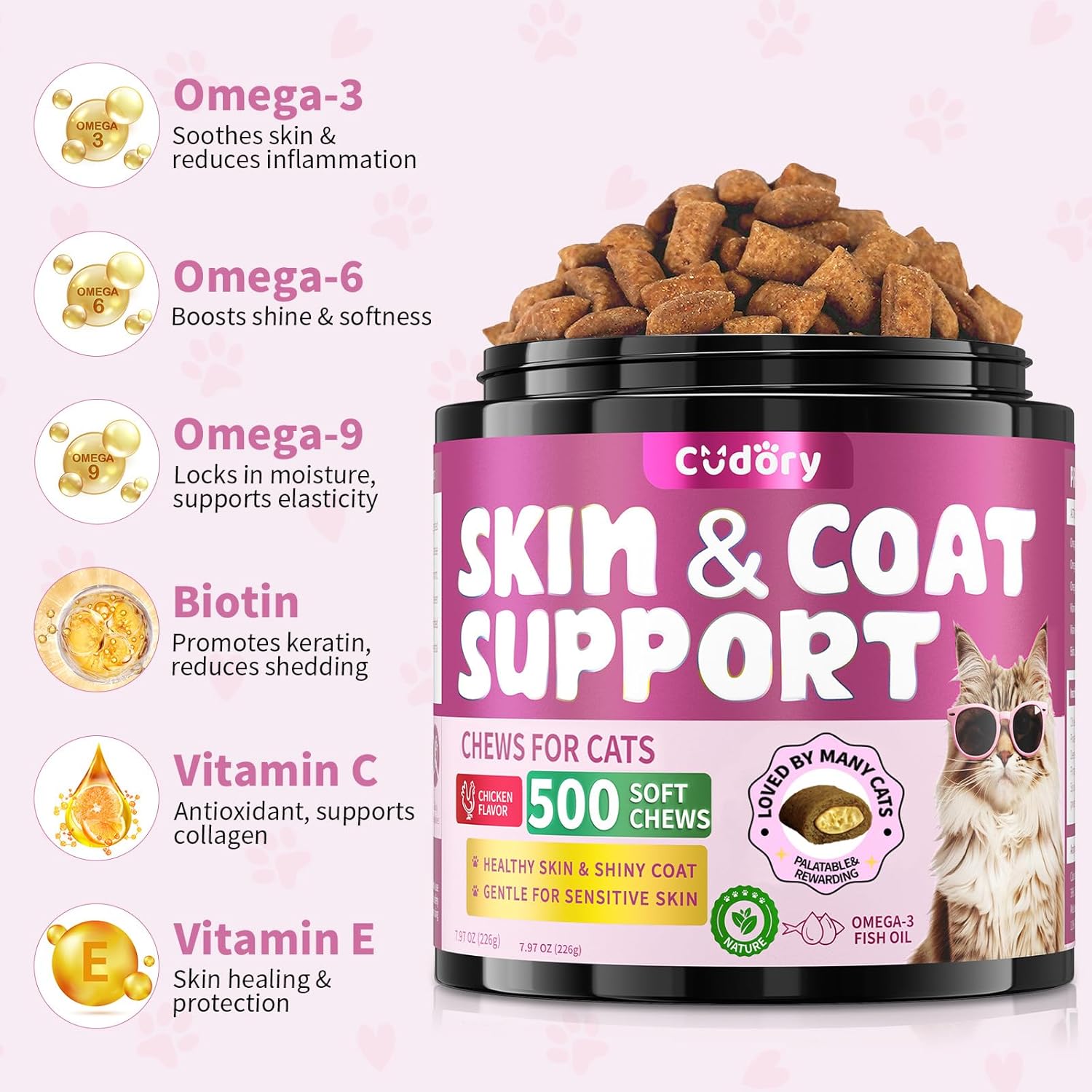 Omega 3 for Cats - 500 Skin & Coat Health Crunchy & Creamy Chews with Omega 3, Biotin & Vitamin E for Healthy Skin, Shiny Fur, Cat Supplements & Vitamins -Chicken Flavor