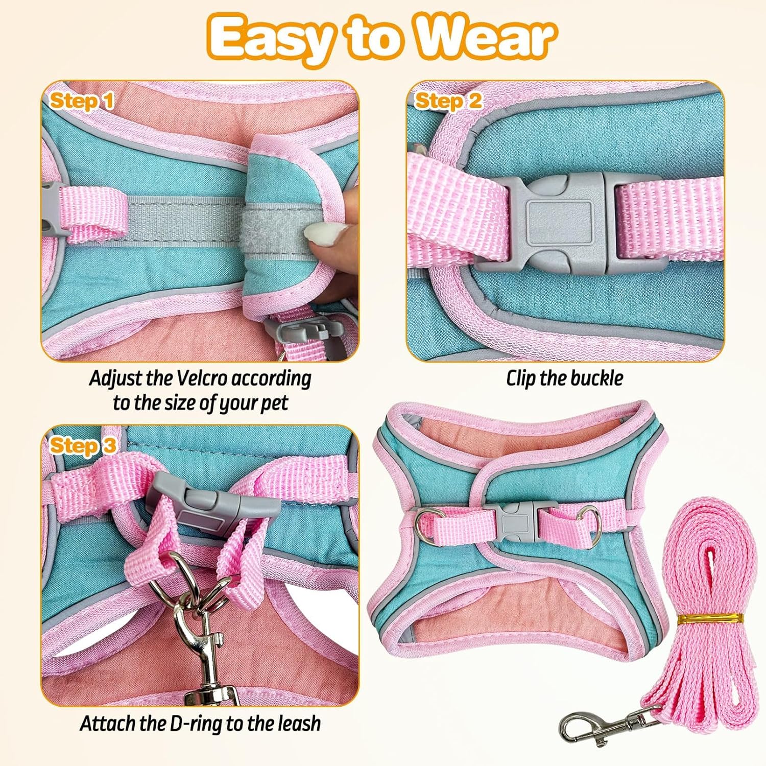 - Dual Protection: This rabbit harness and leash features a combination of Velcro and sturdy buckles for double security, avoiding your pet from slipping out of the leash. The Velcro allows for easy adjustment of tightness, providing your pet with a comfortable wearing experience