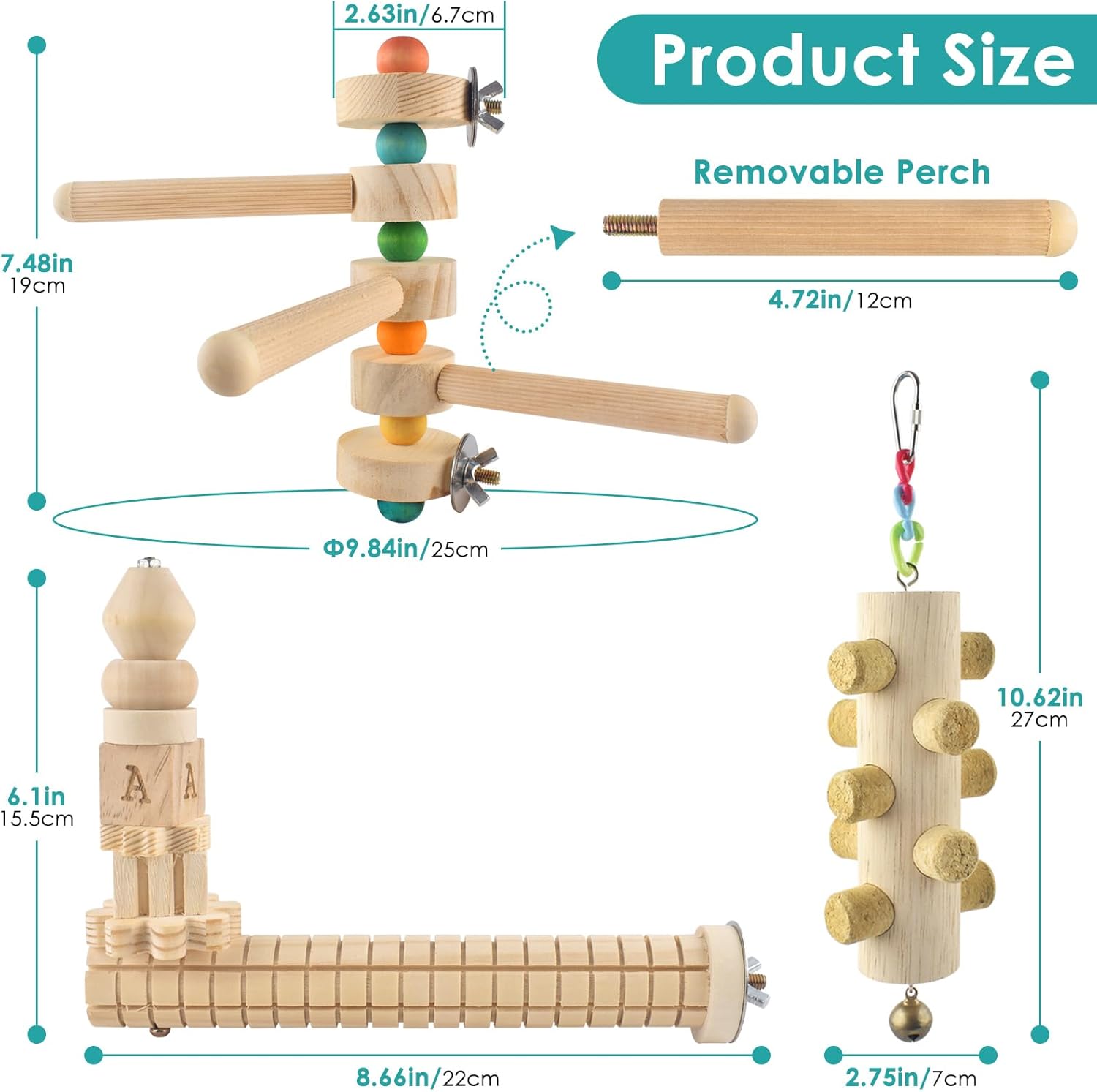 - What You Get: DBNESS bird parrot toy set includes: 1 x L-shaped bird perch with chewing wooden block, 1 x rotating 3-branch parrot perches, 1 x bird hanging removable cork chew toy. Provides a variety of parrot toy types to meet your bird's daily play needs. (Note: Rotating 3 branches of the parrot perch are removable, please check that they are securely mounted before use)