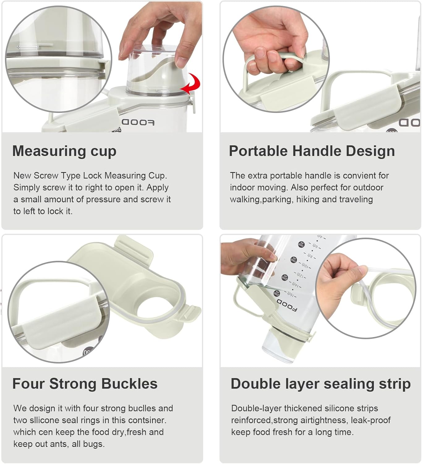 - Upgraded and Lmproved Versions:We have optimized and improved the mold the pour spout is large enough to pour out the big dog Food,You can pour out the food easy and fast now. The new upgraded Measuring Cup is also easy to screw on the spout now.The lid with snaps can also be easily closed on the barrel body.