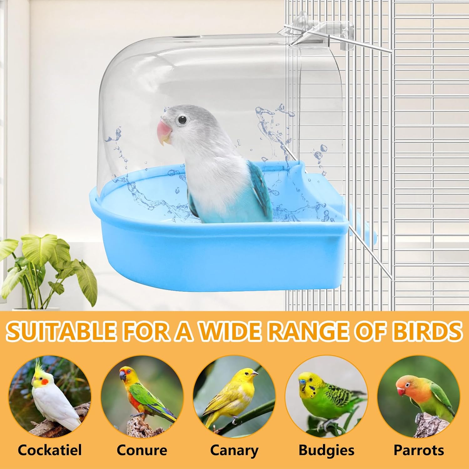- ANTI-ESCAPE DESIGN: This conure bird bath for cage is equipped with a protective cover; prevents birds from escaping, food and water spills; keeps the bird cage surroundings clean and sanitary; allows you to feed and bathe your birds with peace of mind; and the clear construction allows you to enjoy watching the spills