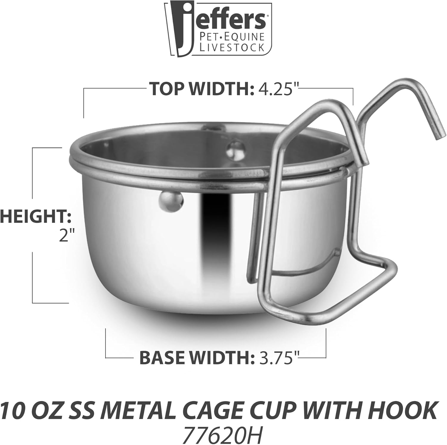 Jeffers Pet Stainless Steel Cage Cup Pet Feeder with Hooks for Birds, Rabbits, Ferrets, Kittens & Small Animals – Hanging Food Water Bowl Dish for Cages, Crates, Kennels - Dishwasher Safe - 10 oz