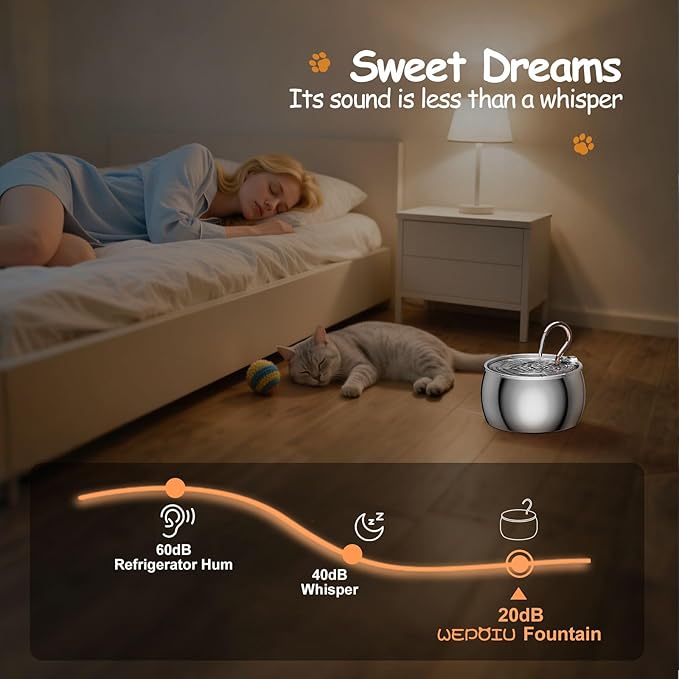 - Ultra-quiet, perfect capacity 2.5L/84oz: The water fountains for cats indoor is equipped with a near-silent 1.5W low-power pump, its sound (<20dB) is less than a whisper, so you can enjoy unparalleled tranquility.2.5L perfect capacity for both space-saving and 5-7 days of water supply to avoid bacterial growth due to the large tank of stagnant water, to take care of your pet's health, and at the same time do not need to worry about replenishment issues.