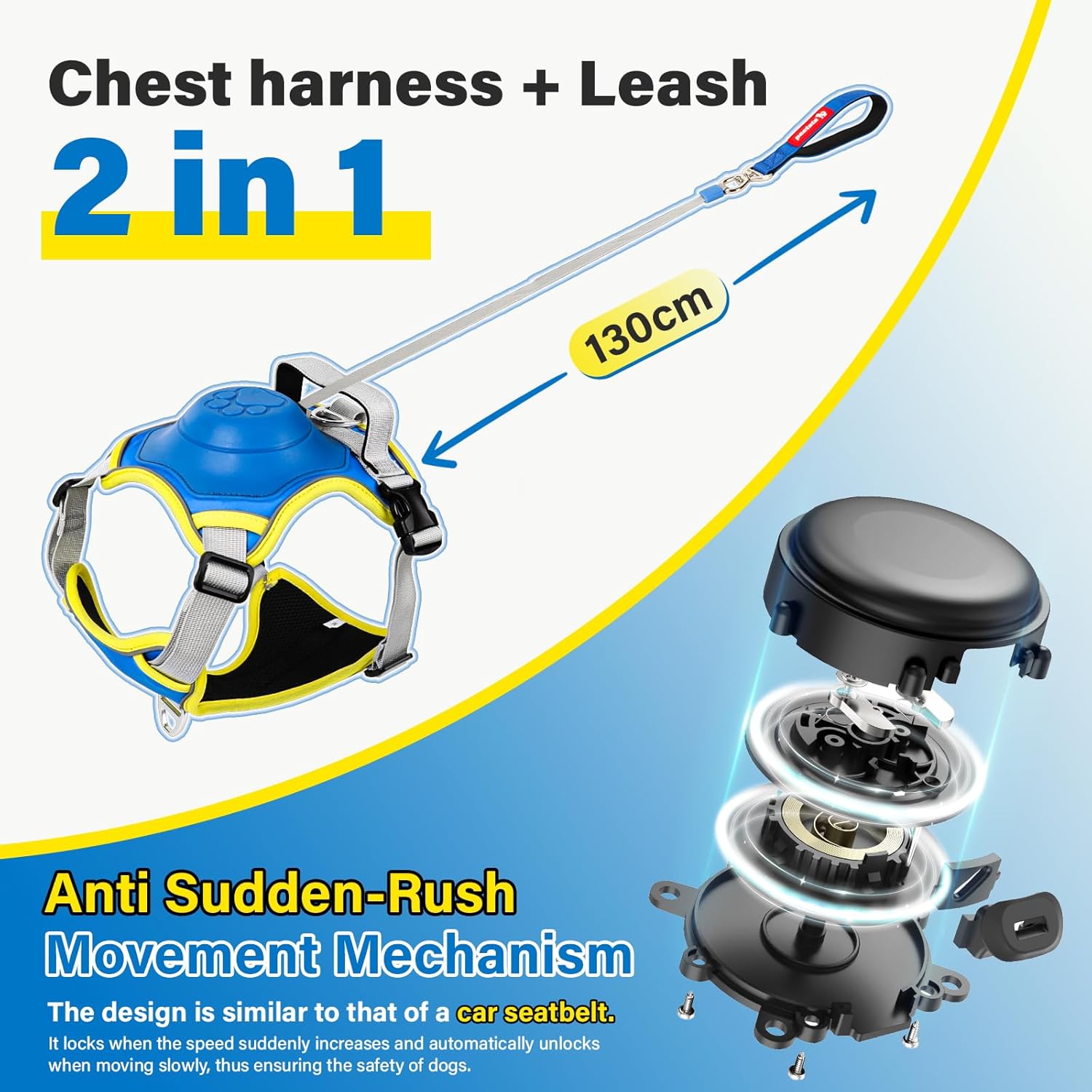 - No Pull Auto-Retractable Leash: 2-in-1 Dog Harness & Leash. Built-in retractable leash extends up to 1.3m. Car seatbelt-inspired designWhen the dog suddenly accelerates, the owner pulling the leash quickly triggers the internal mechanism to auto-lock the leash length ; unlocks when owner pulls slowly.When the leash is in the retracted state, it frees the owner's hands, allowing the dog to play freely.